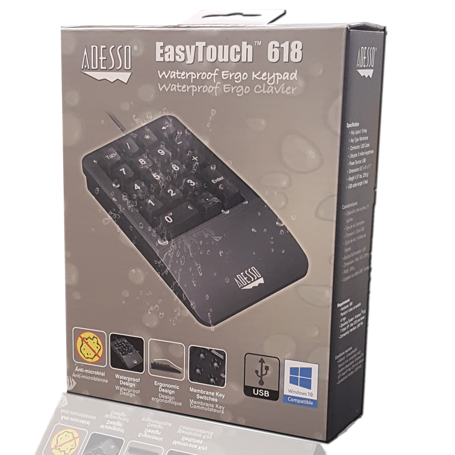 The Adesso AKB-618 Easy Touch Waterproof Ergo Keypad offers desktop and notebook users the benefits of a full-sized external numeric keypad in a compact size, featuring 18 quiet membrane keys.The membrane switches inside each key feature a 5 million keystroke lifecycle. Innovative and portable, the Adesso AKB-618 is designed for those on the go, notebook users, point of sale, kiosks, accounting and financial institutions, libraries and more! Even casual gamers will appreciate the precision of the keypad.
