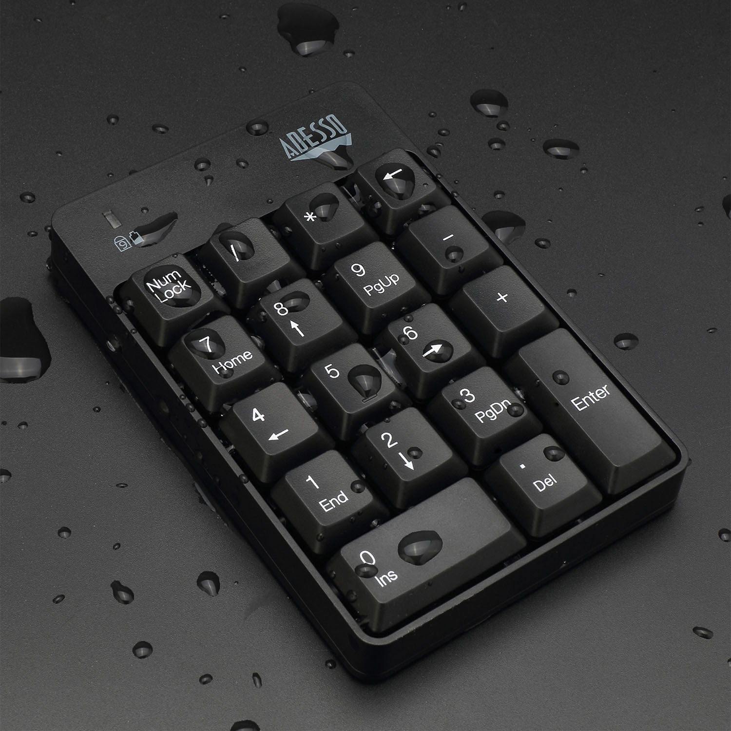 The Adesso WKB-6010UB spill resistant 18-key keypad is the keypad that you deserve to have for many reason. To begin with, it is wireless, eliminating any unnecessary wires and keep your working station neat and organized. It is also extremely compact and lightweight which makes it portable. Its membrane key switch also provides a quiet typing experience that lasts up to five million keystrokes. Perhaps the greatest feature that the WKB-601UB has is that it is spill resistant. The structural design of the casing is meant for fluids to exit out of the unit in case of accidental spills. Next time when you accidently spill drinks while using your numeric kepad you can be assured those fluids will not trap inside the keypad causing damage to your device.