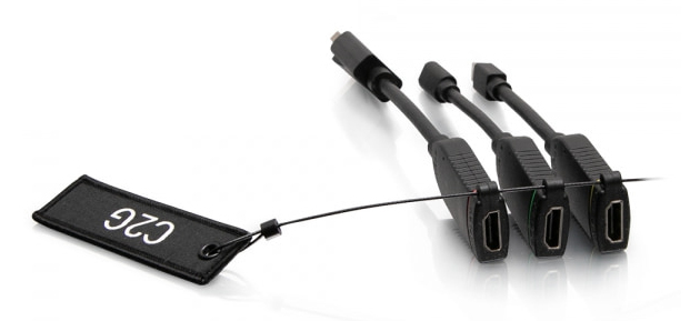 The universal cable mount attaches directly to the in-room HDMI display cable, ensuring that the adapters are always within reach. The adapter ring slides to the HDMI connector when needed and out of the way when not in use, reducing strain on the HDMI cable and clutter on the tabletop. The optional stopper fits on HDMI cables from 5mm to 10mm in diameter and prevents the adapters from sliding too far down the cable.