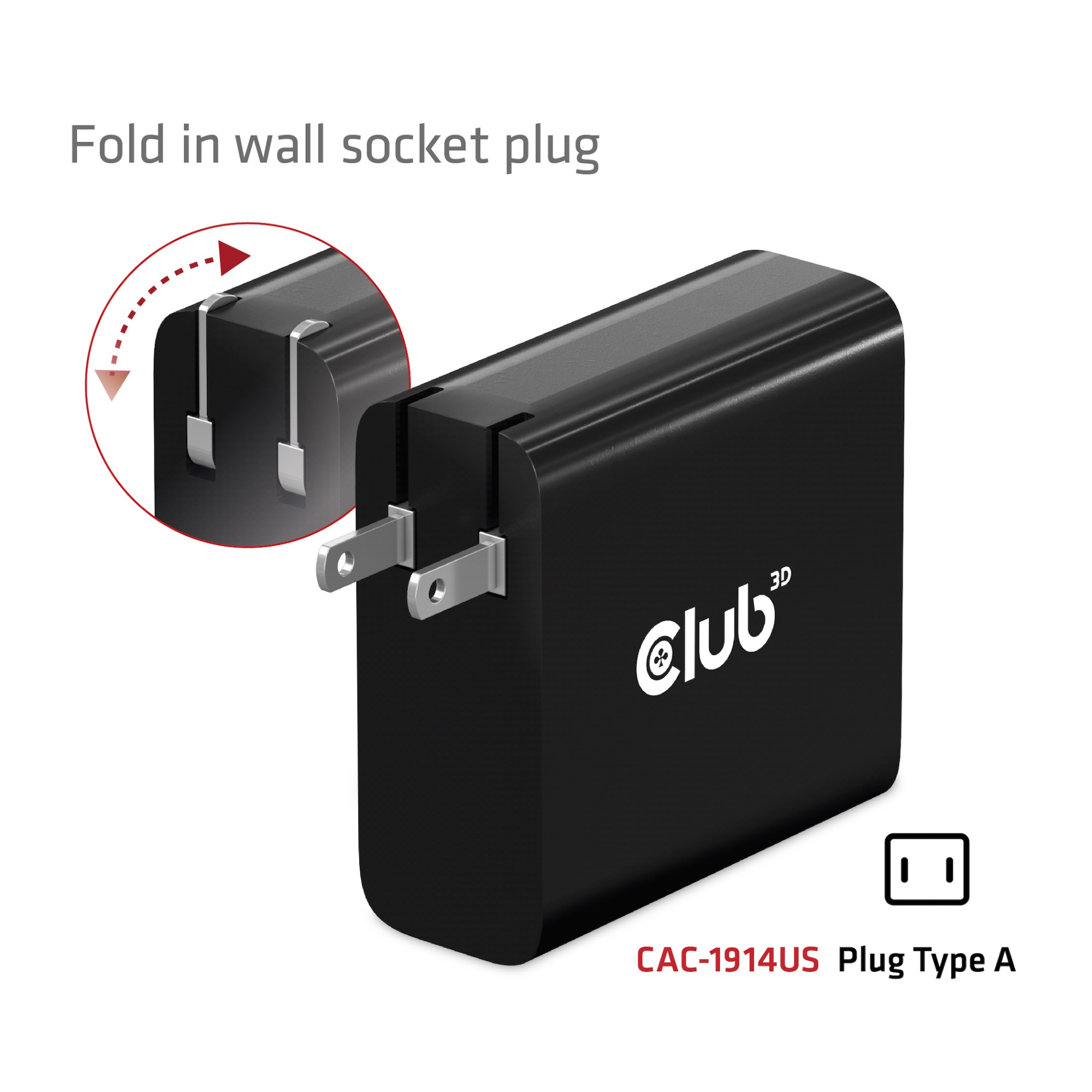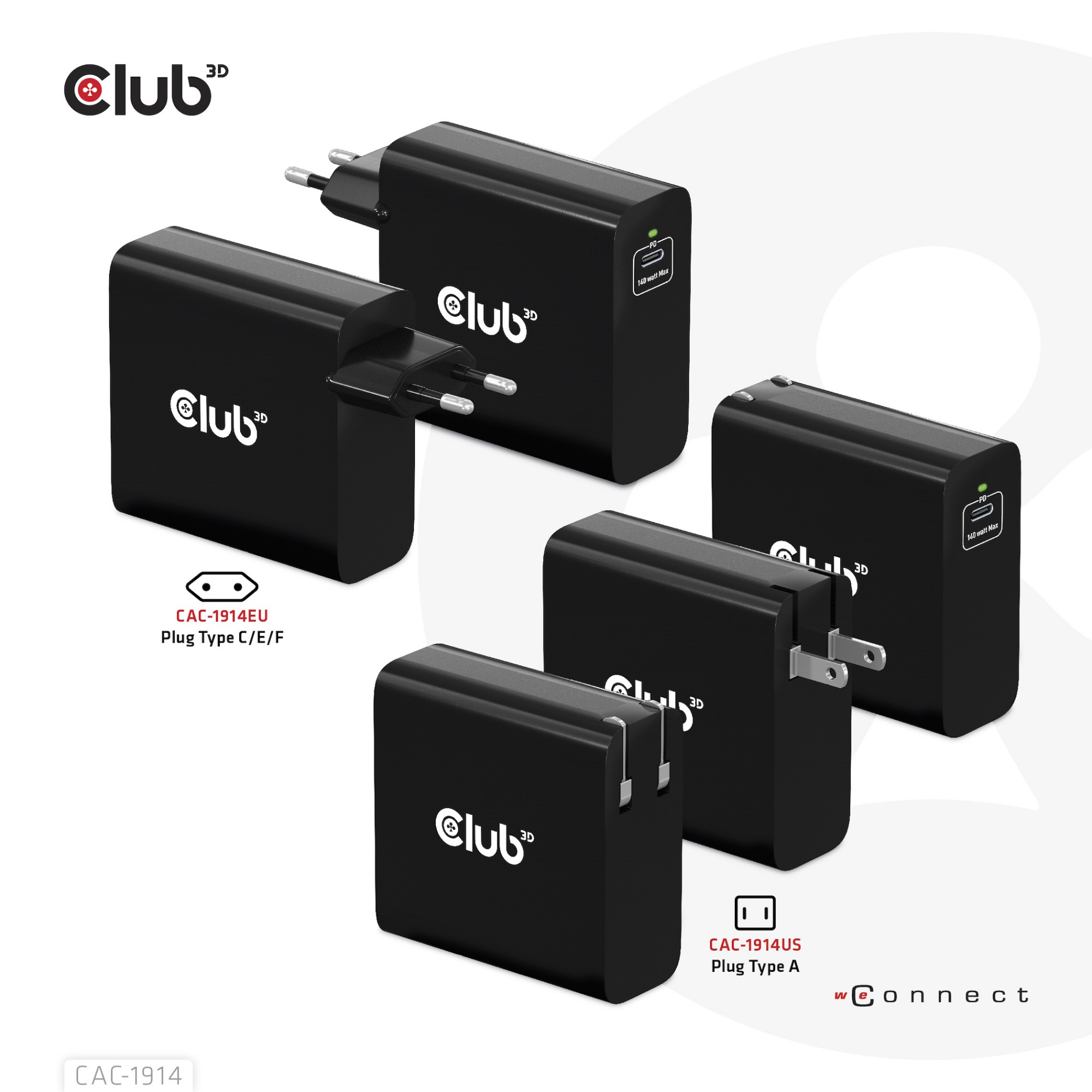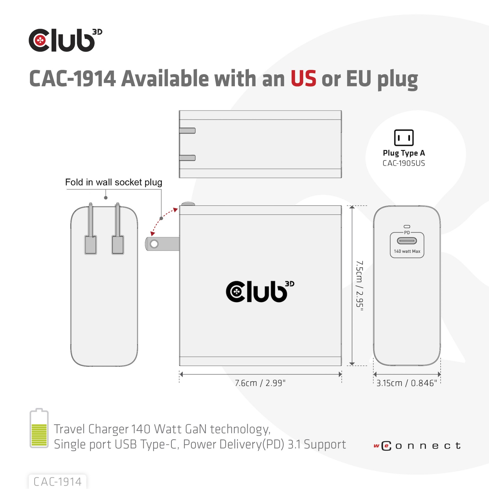 The Club 3D CAC-1914 Travel Charger 140 Watt GaN technology, Single port USB Type-C, Power Delivery(PD) 3.1 Support is Compact in size & Superior in Performance: GaN technology chipset makes this charger 50% smaller than a traditional 140Watt Laptop charger, small enough to carry anywhere. Our CAC-1914 140Watt wall charger match a variety of PD devices from smart phones to laptops, one for all making charging simple. This wide compatibility charger will be your convenient companion during your business trip or vacation.