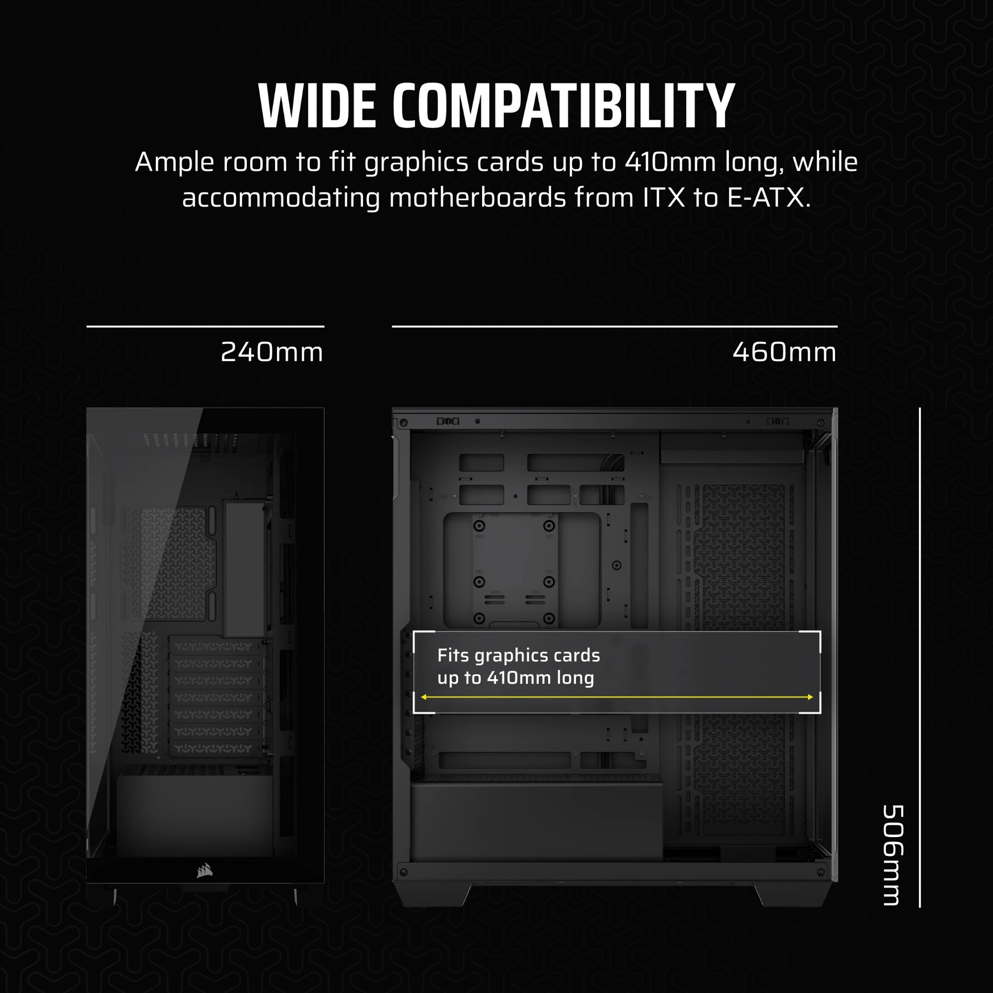 You don’t need a large footprint to build a decked-out PC. The 3500X accommodates most large graphics cards and CPU coolers, 360mm radiators, and even EATX motherboards – without taking up your entire desk.