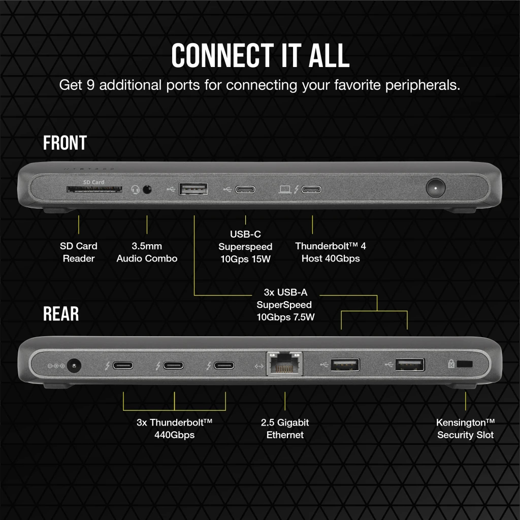 The CORSAIR TBT200 Thunderbolt™ 4 dock provides an easy plug-and-play expansion for your workstation. Connect a multitude of devices and displays with a single Thunderbolt™ 4 port with full backward compatibility for Thunderbolt™ 3 devices.*