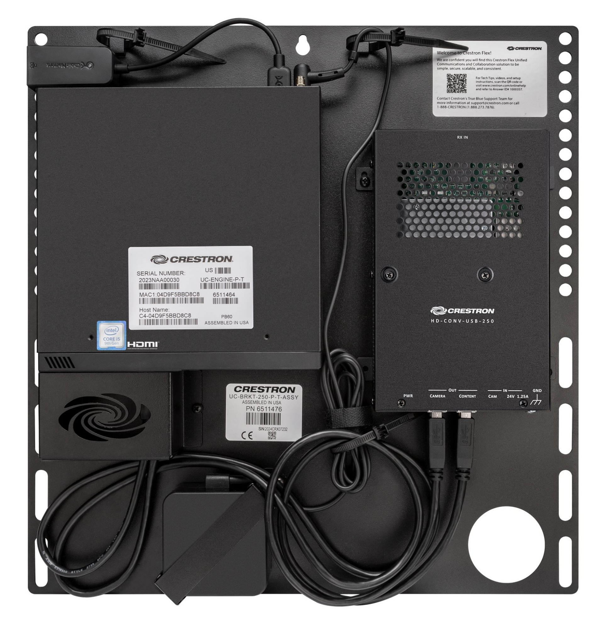 The UC Bracket Assembly provides preassembled components on one ready-to-mount bracket to simplify installation. The assembly can be mounted on a wall, or it can be attached to the rear of the display device. Crestron's direct connection method further simplifies installation with a single connection from the Crestron Flex tabletop conference device to the UC Bracket Assembly.3
