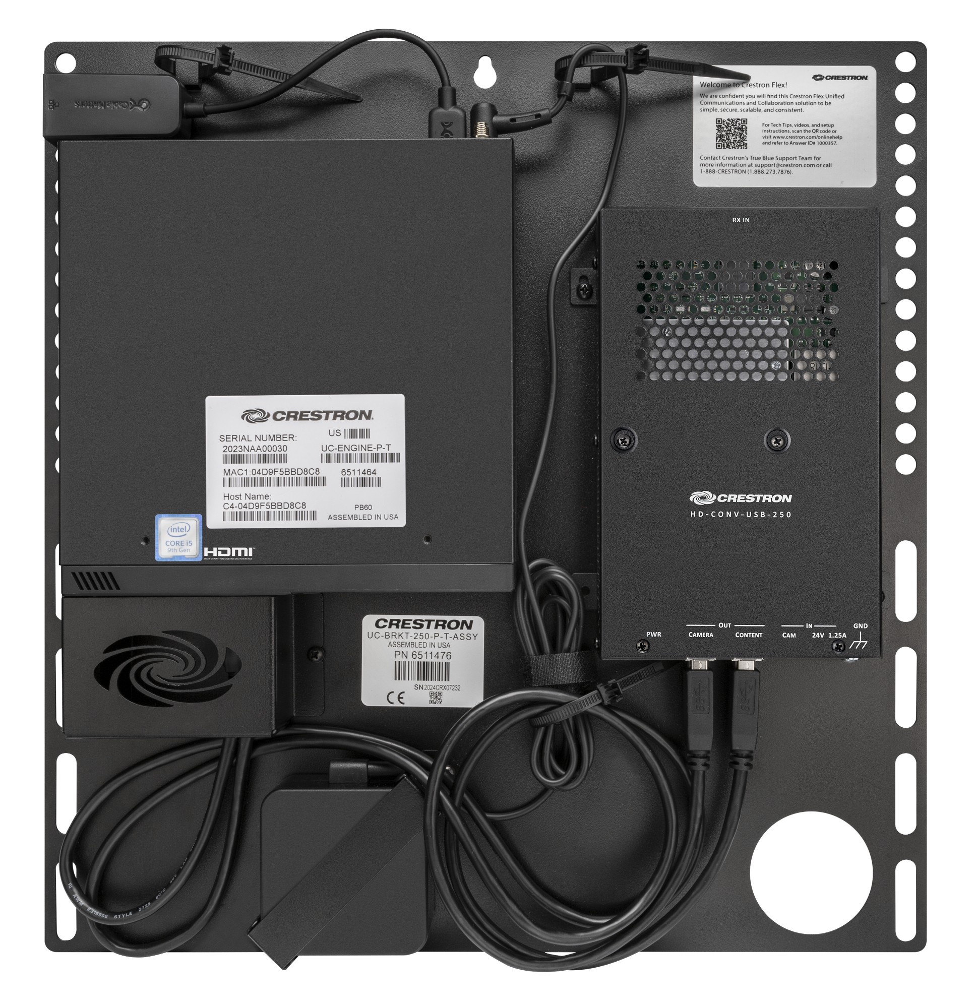 The UC Bracket Assembly provides preassembled components on one ready-to-mount bracket to simplify installation. The assembly can be mounted on a wall, or it can be attached to the rear of the display device. Crestron's direct connection method further simplifies installation with a single connection from the Crestron Flex tabletop conference device to the UC Bracket Assembly.