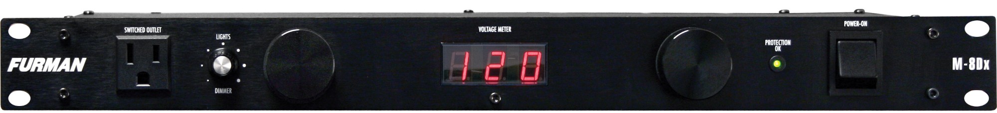 A Merit Series Power Conditioner is the perfect low-cost AC power solution for any rack mount system. Install an M-8Dx into the top slot of your rack, and the eight switched outlets in the rear panel will power up and protect all your equipment up to a 15-amp load. The M-8Dx features two slide out, swiveling light fixtures to provide discreet illumination of your equipment on stages, in studios, and in other dark places. A dimmer knob lets you adjust the lamp brightness to just the right level.The M-8Dx also features a bright red, three-digit LED voltmeter that displays incoming voltage.