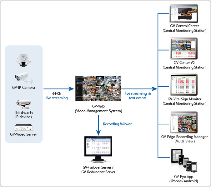 GV-VMS is a comprehensive video management system that records up to 64 channels of GeoVision and/or third-party IP devices. The live view and playback layout can be easily adjusted with the intuitive drag-and-drop function. GV-VMS comes with a variety of intelligent video analytics to offer precise monitoring and to reduce the need for manual supervision. The built-in Webcam Server allows users to remotely access live view and recordings from anywhere using Web browsers, mobile app and Remote ViewLog. Compatibility with GV-CMS (GeoVision Central Monitoring Station) and interoperability with a wide selection of third party IP cameras through ONVIF and PSIA make GV-VMS a versatile and effective surveillance solution.