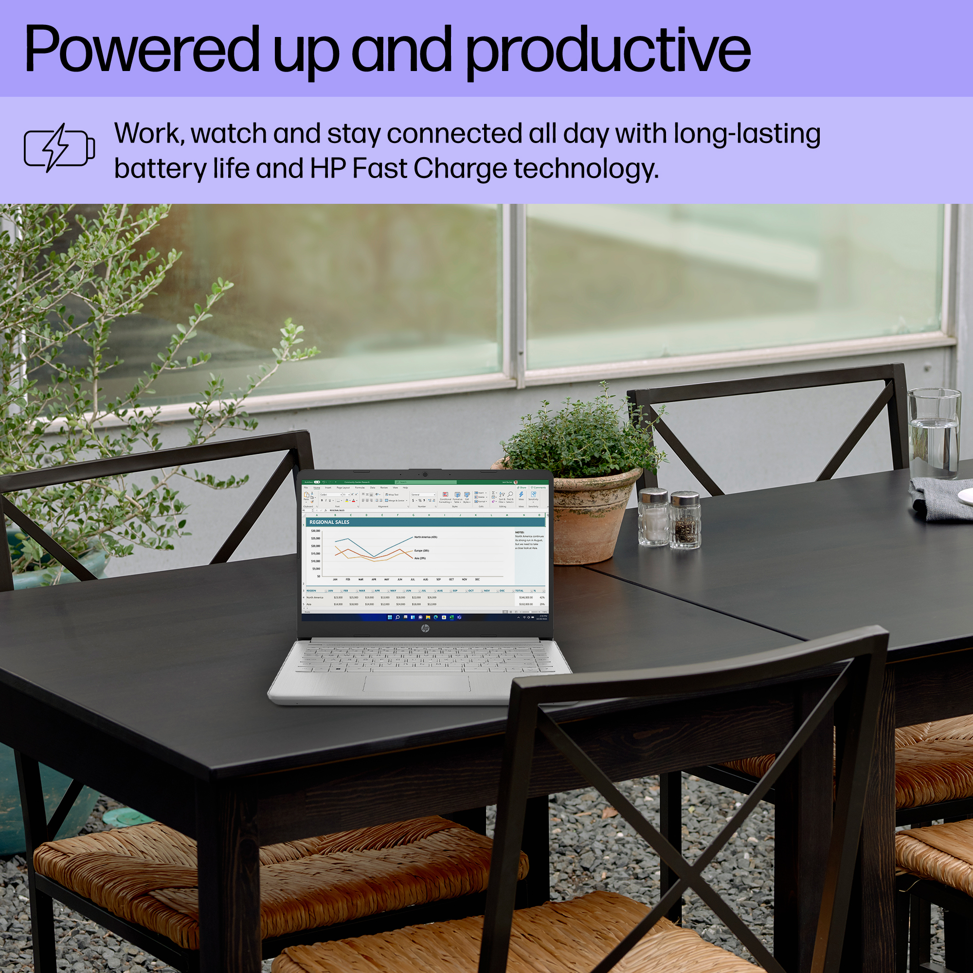 The long battery life<sup>[3]</sup> and HP Fast Charge<sup>[4]</sup> technology let you work, watch, and stay connected all day.