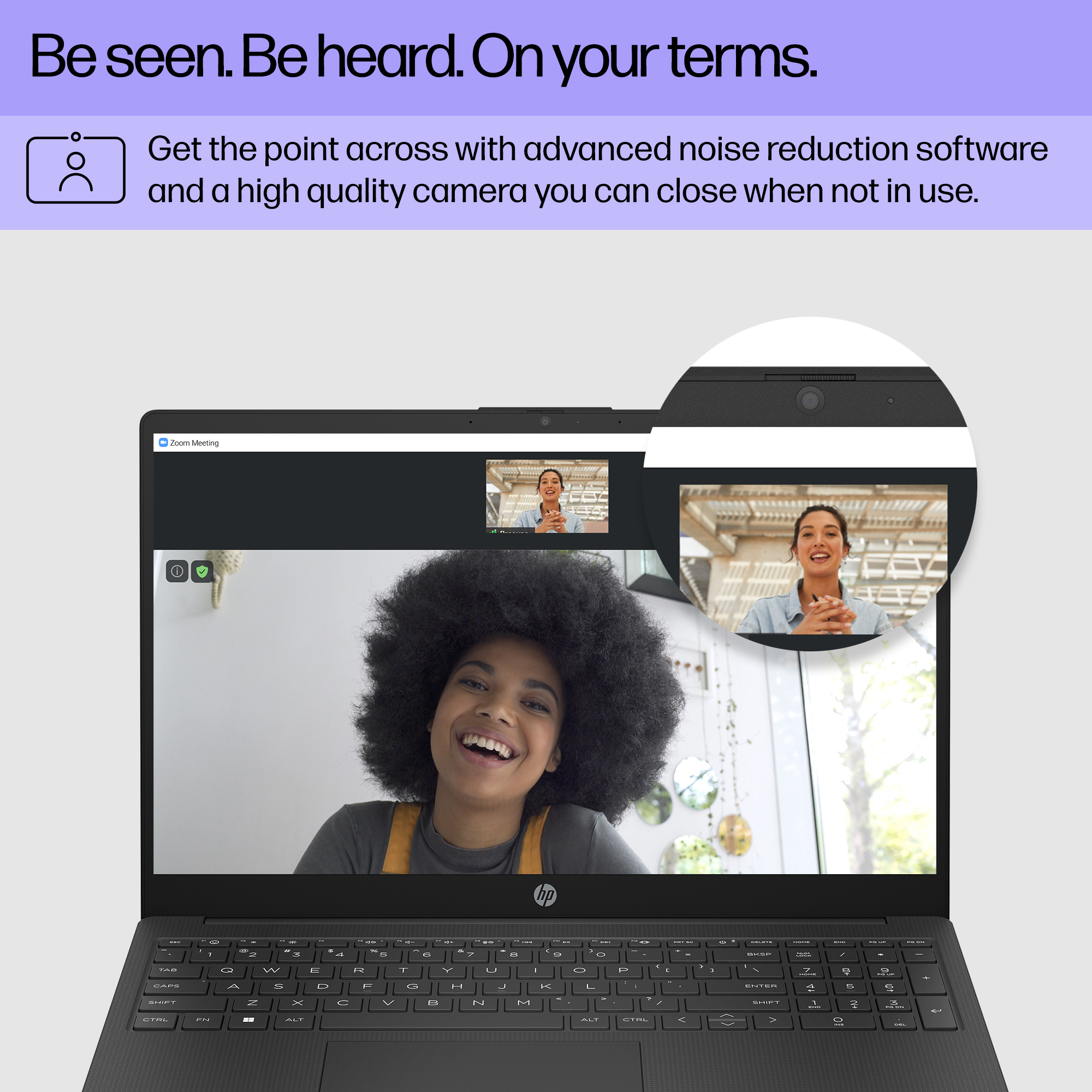 Made for collaboration with a HP True Vision Camera<sup>[3]</sup> with a privacy door, dual mics, and advanced noise-reduction.