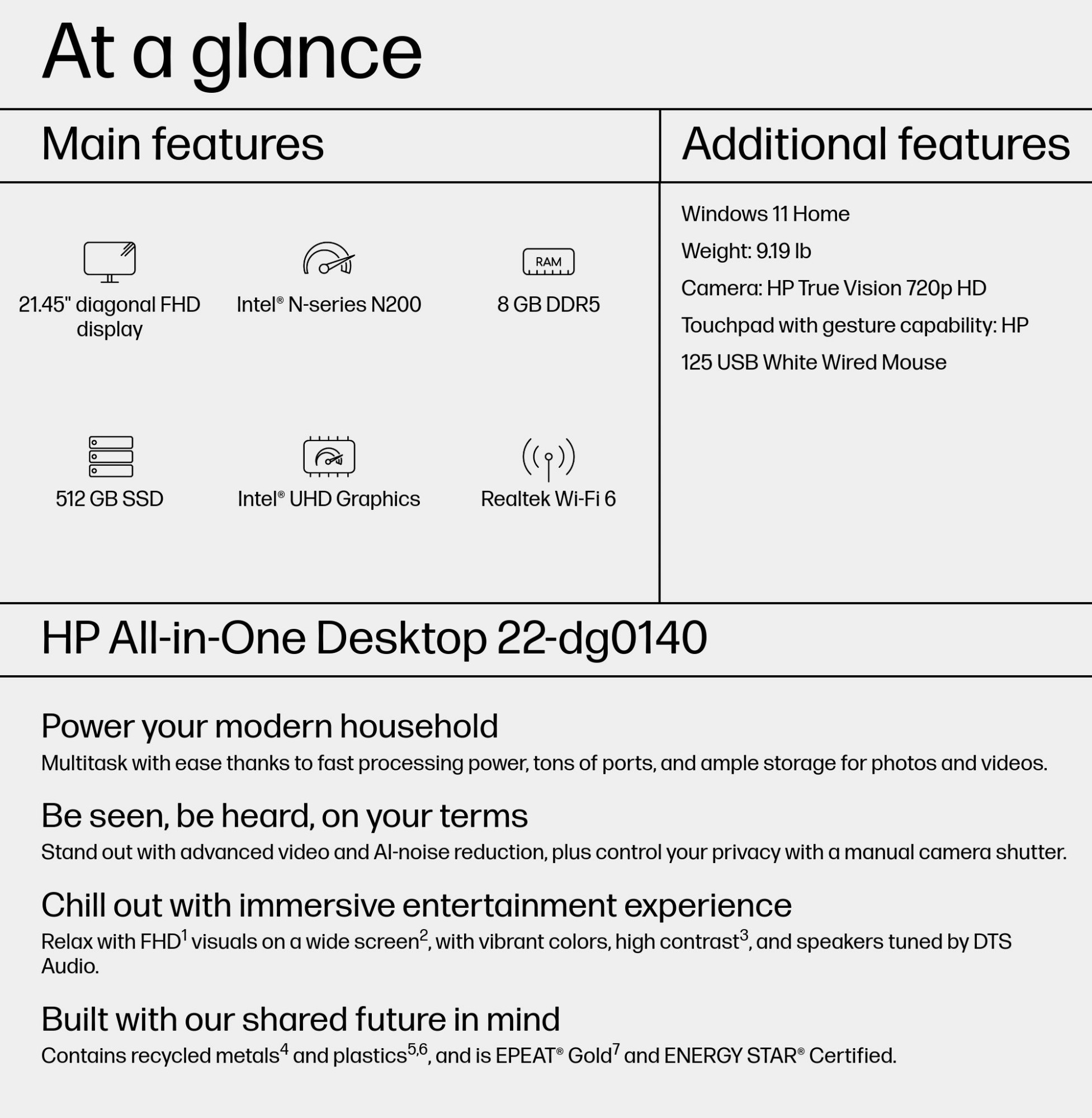 HP All-in-One Desktop 22-dg0140 Intel® Pentium® N200 21.45" 1920 x 1080 pixels 8 GB DDR5-SDRAM White