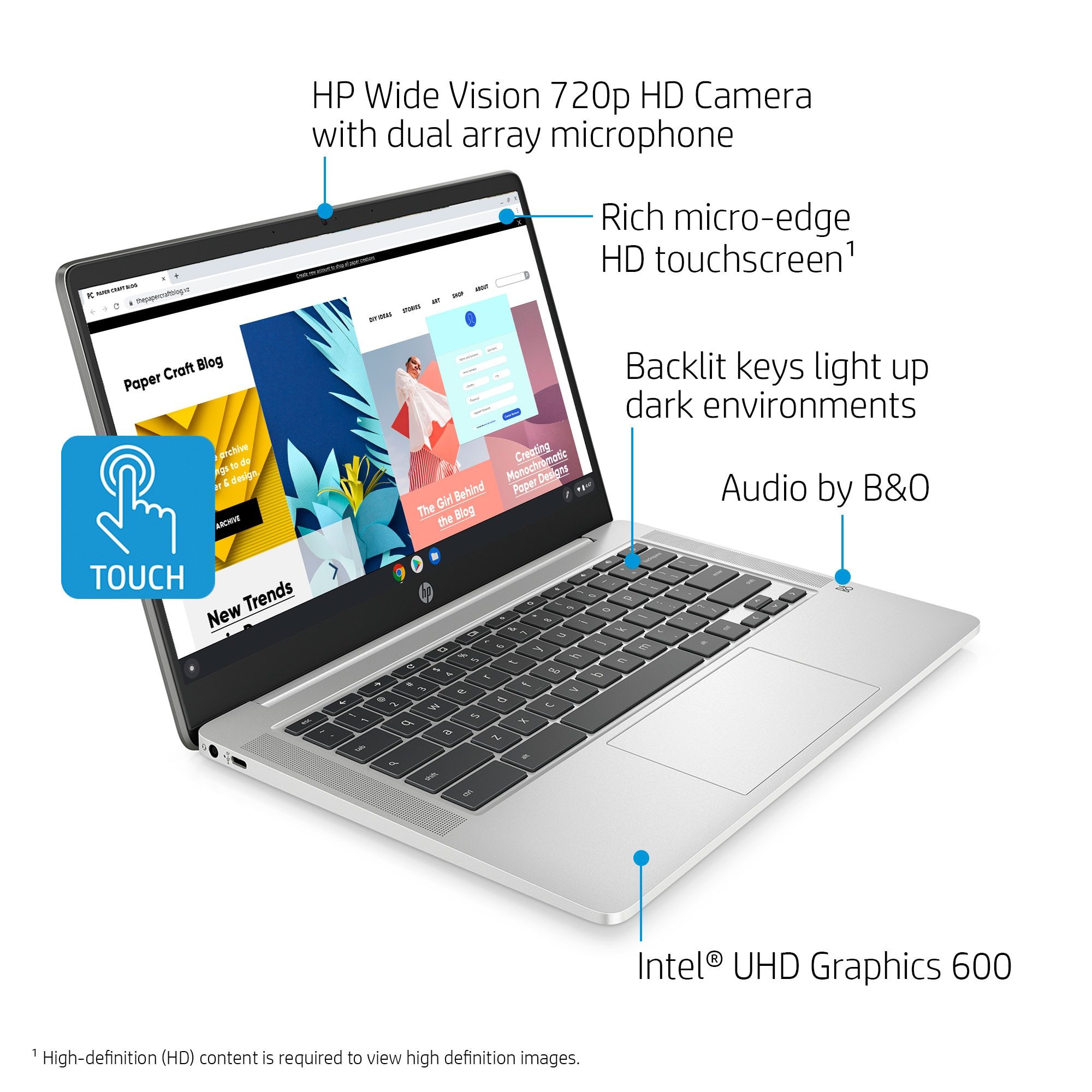 HP Chromebook 14a-na0015ds. Processor family: Intel® Celeron®, Processor model: N4120, Processor frequency: 1.1 GHz. Display diagonal: 14", HD type: HD, Display resolution: 1366 x 768 pixels. Internal memory: 4 GB, Internal memory type: LPDDR4-SDRAM