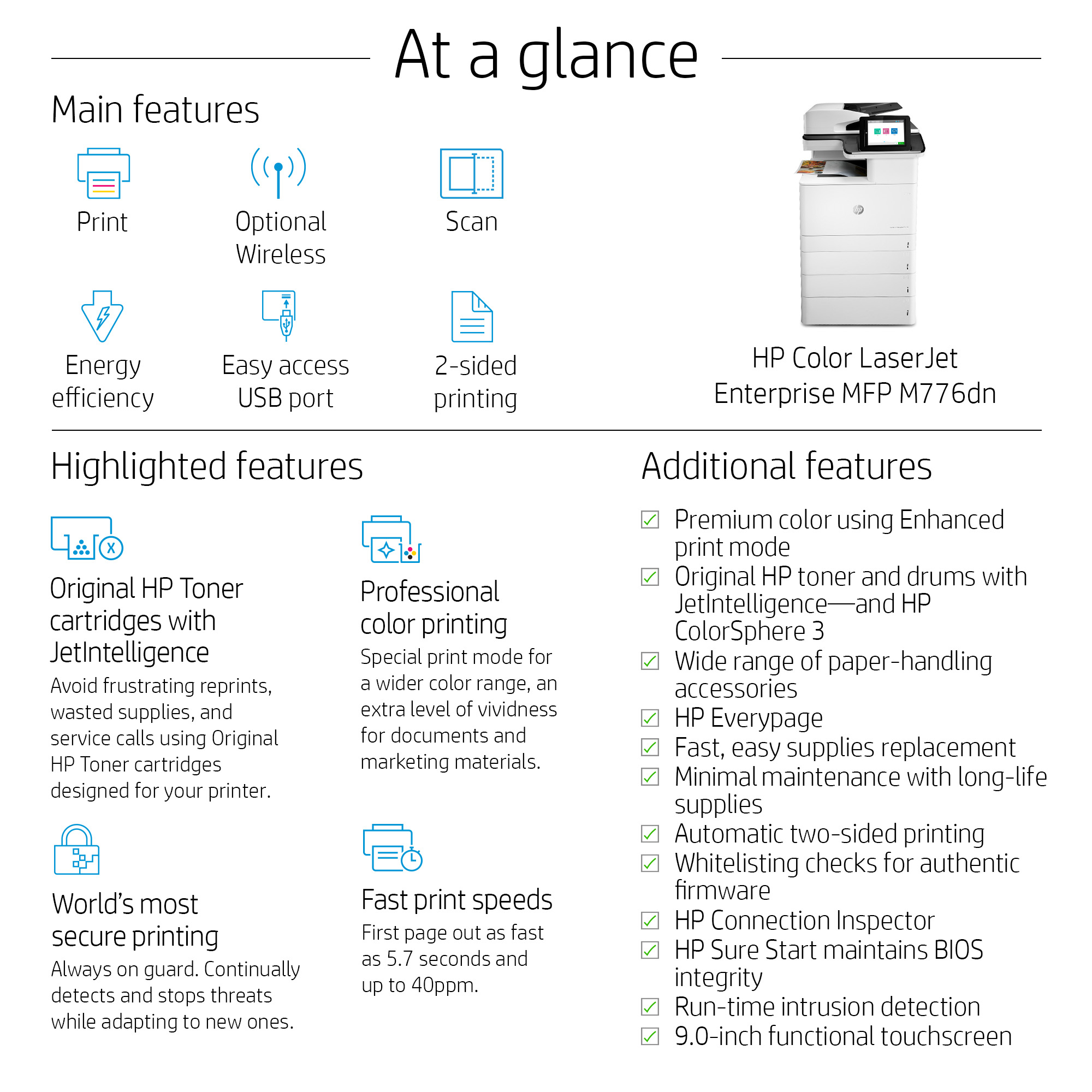 | Box contents | HP Color LaserJet Enterprise MFP M776dn printer; HP Black Original LaserJet Toner Cartridge (~16,000 pages), HP Cyan, Magenta and Yellow Original LaserJet Toner Cartridges (~13,000 pages each), and 4 HP Original LaserJet Imaging Drums (~65,000 pages each color); Getting started Guide; 1 Power cord |
