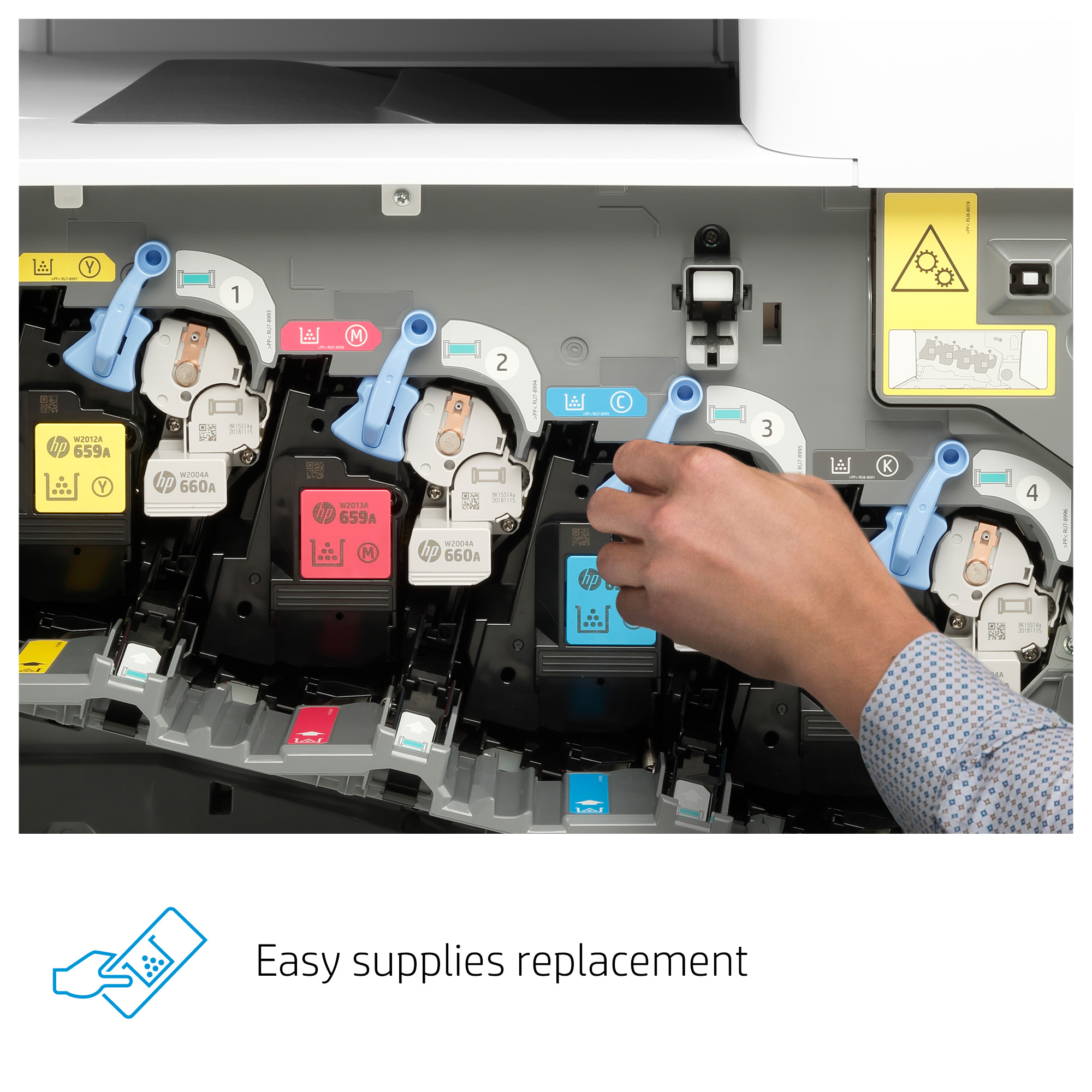 | Replacement cartridges | W2010A HP 659A Black LaserJet Toner Cartridge (~16,000 pages); W2011A HP 659A Cyan LaserJet Toner Cartridge (~13,000 pages); W2012A HP 659A Yellow LaserJet Toner Cartridge (~13,000 pages); W2013A HP 659A Magenta LaserJet Toner Cartridge (~13,000 pages); W2010X HP 659X Black LaserJet Toner Cartridge (~34,000 pages); W2011X HP 659X Cyan LaserJet Toner Cartridge (~29,000 pages); W2012X HP 659X Yellow LaserJet Toner Cartridge (~29,000 pages); W2013X HP 659X Magenta LaserJet Toner Cartridge (~29,000 pages); W2004A HP 660A Original LaserJet Imaging Drum (~65,000 pages, universal for all 4 colors) |