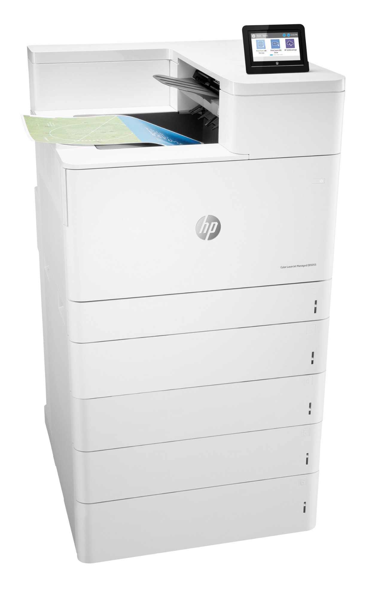 | Box contents | HP Color LaserJet Managed E85055 Printer; HP Black Original LaserJet Toner Cartridge (~16,000 pages), HP Cyan, Magenta and Yellow Original LaserJet Toner Cartridges (~13,000 pages each), and 4 HP Original LaserJet Imaging Drums (~75,000 pages each color); Getting started Guide; Locking Kit (Fixed-size cassette guides, and imaging drum and ITB screws); 1 Power cord |