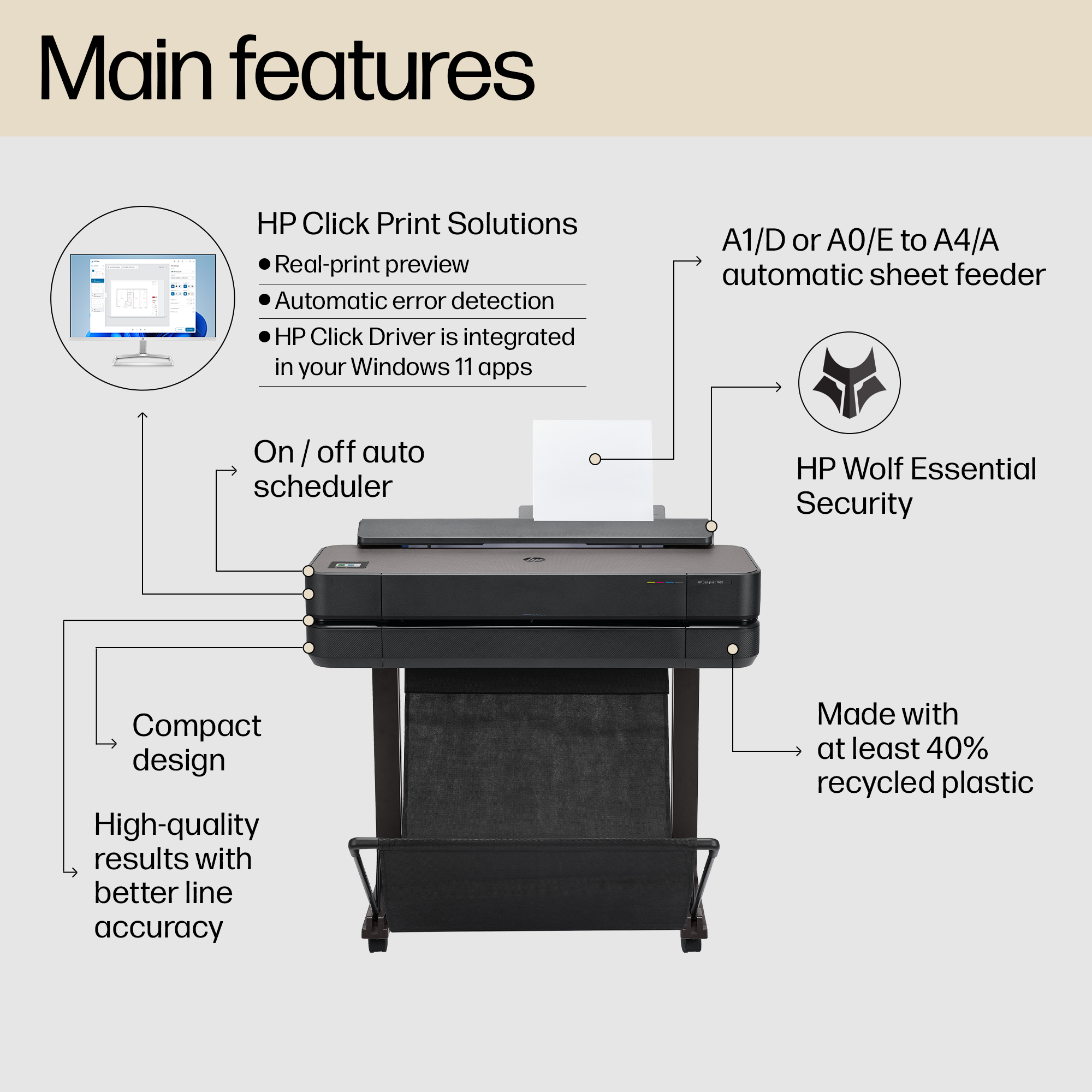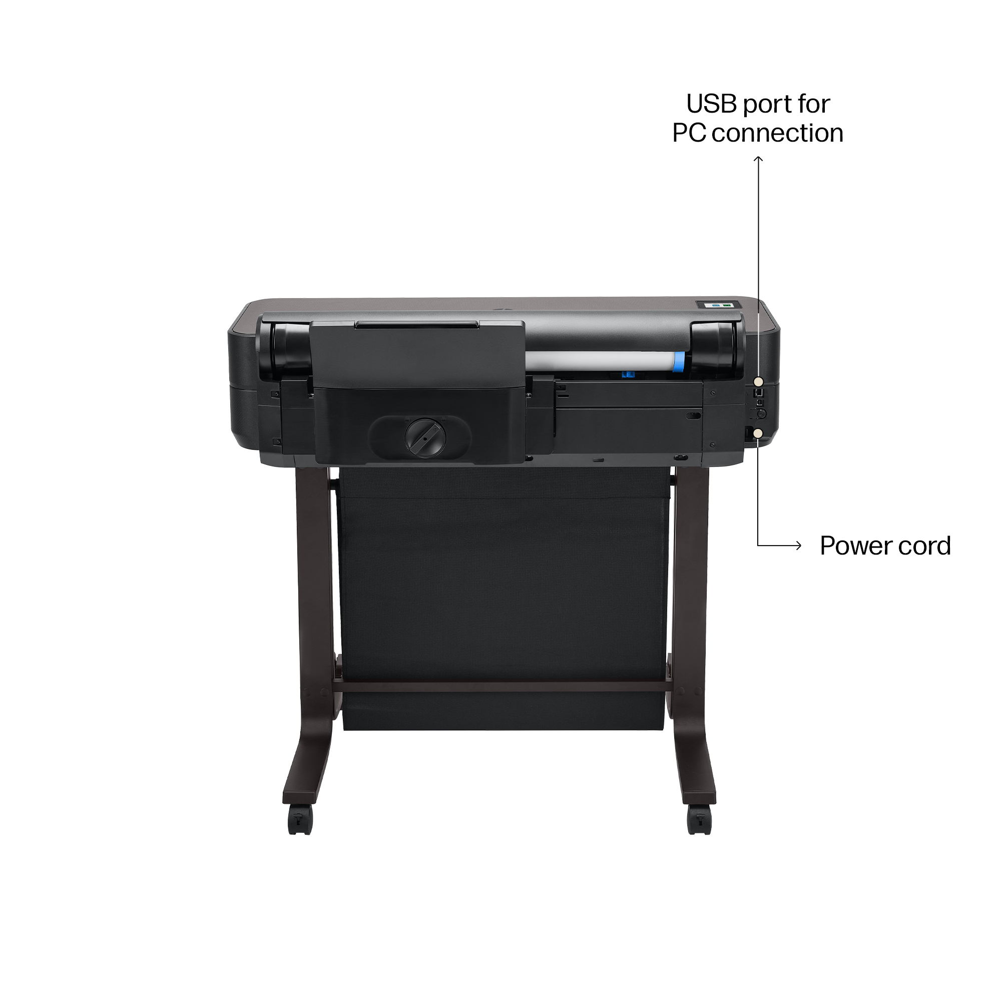 | Box contents | HP DesignJet T650 24-in Printer, printer stand, automatic sheet feeder, roll cover, printhead, introductory ink cartridges, spindle, quick reference guide, setup poster, power cord |