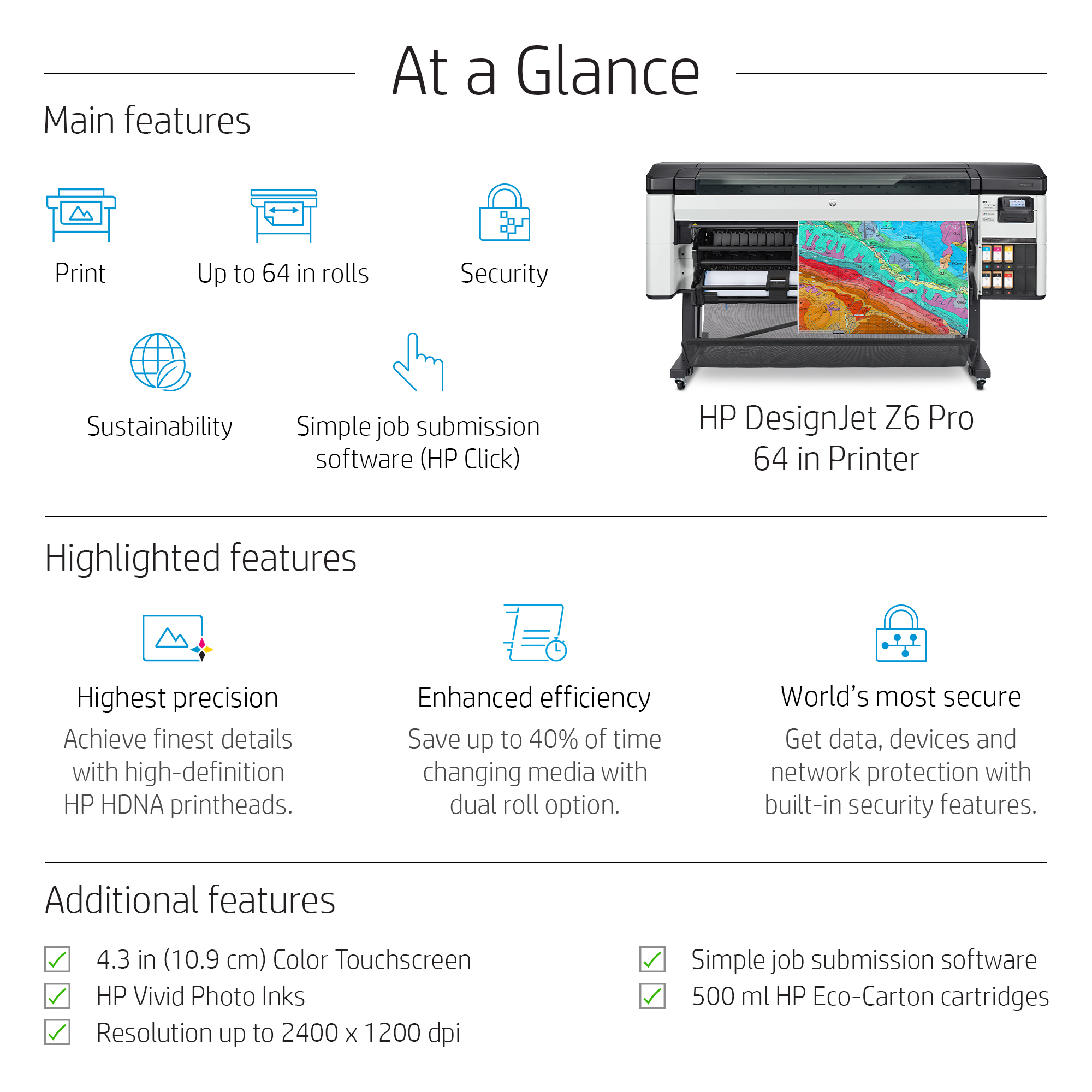 | Box contents | HP DesignJet Z6 Pro Printer, printheads, introductory ink cartridges, maintenance cartridge, printer stand and media bin, 3-in core adapter, quick reference guide, setup poster, power cord, user maintenance kit |