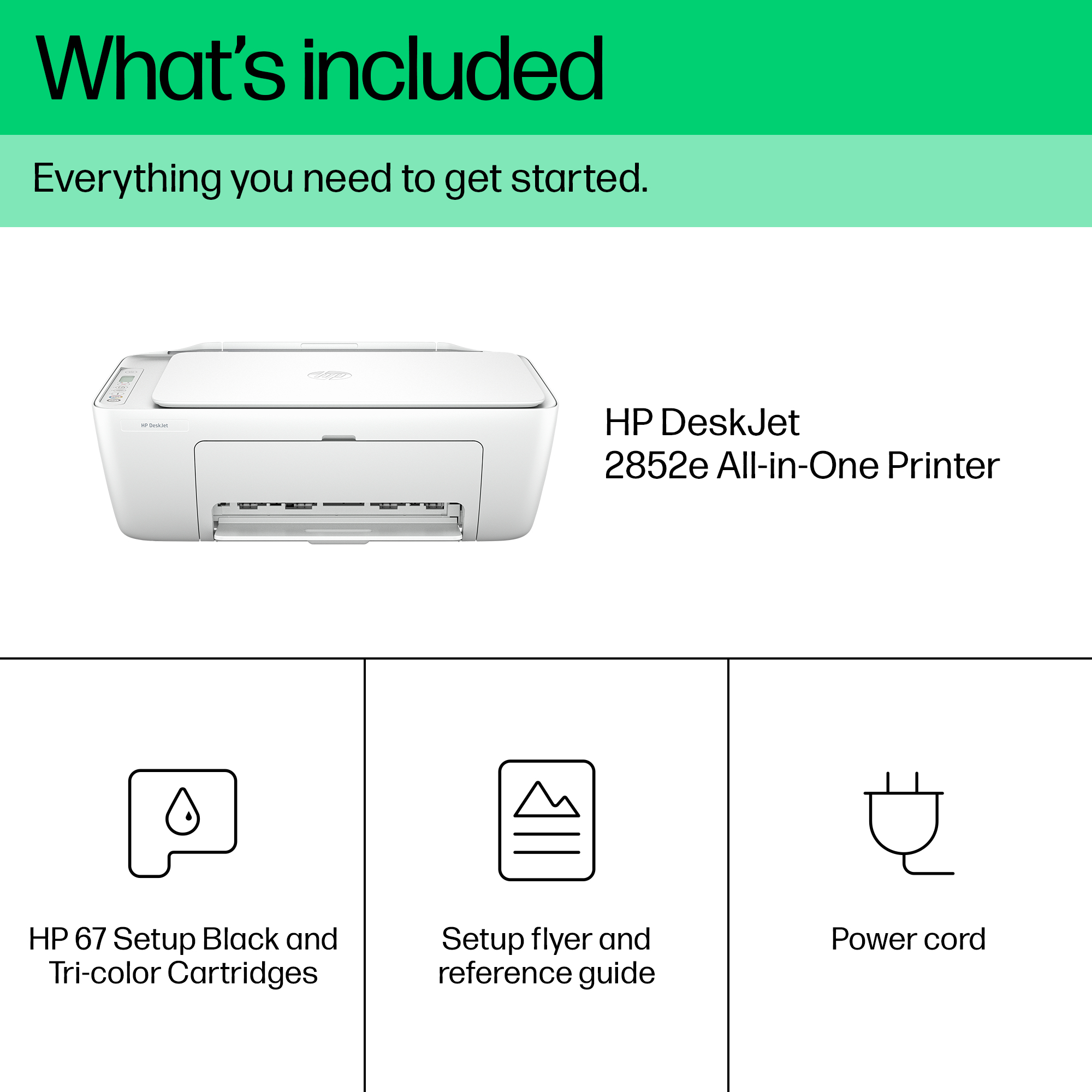 | Box contents | HP DeskJet 2852e All-in-One; HP 67 Setup Black Cartridge; HP 67 Setup Tri-color Cartridge; Regulatory flyer; Setup guide; Reference guide; Power cord [For ink volume and page yield information, visit http://hp.com/go/learnaboutsupplies ] |