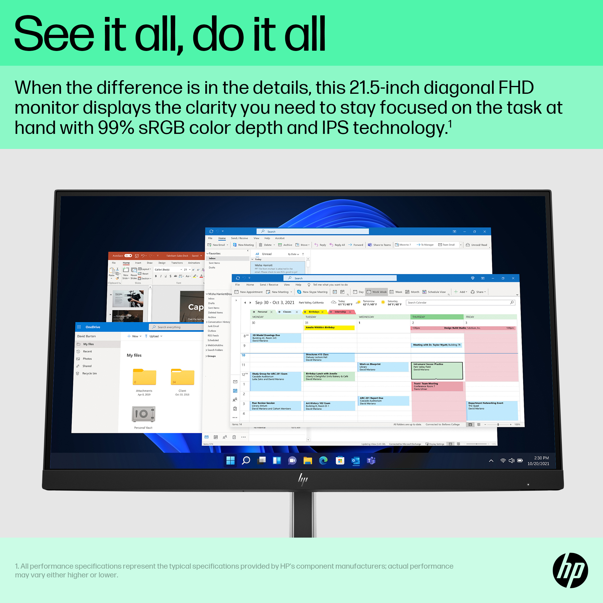 When the difference is in the details, this 21.5-inch diagonal FHD monitor displays the clarity you need to stay focused on the task at hand. With rich 99% sRGB color depth and IPS technology[1], you’ll see clear, vivid colors across wide viewing angles[2].