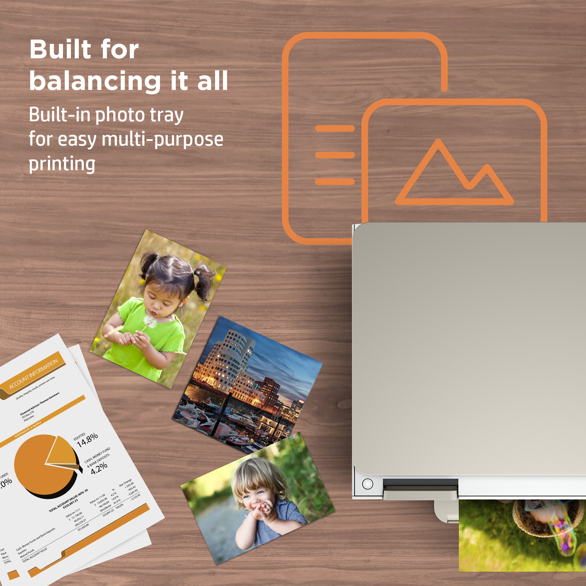 Seamless high-quality photo and document printing with a built-in photo tray.