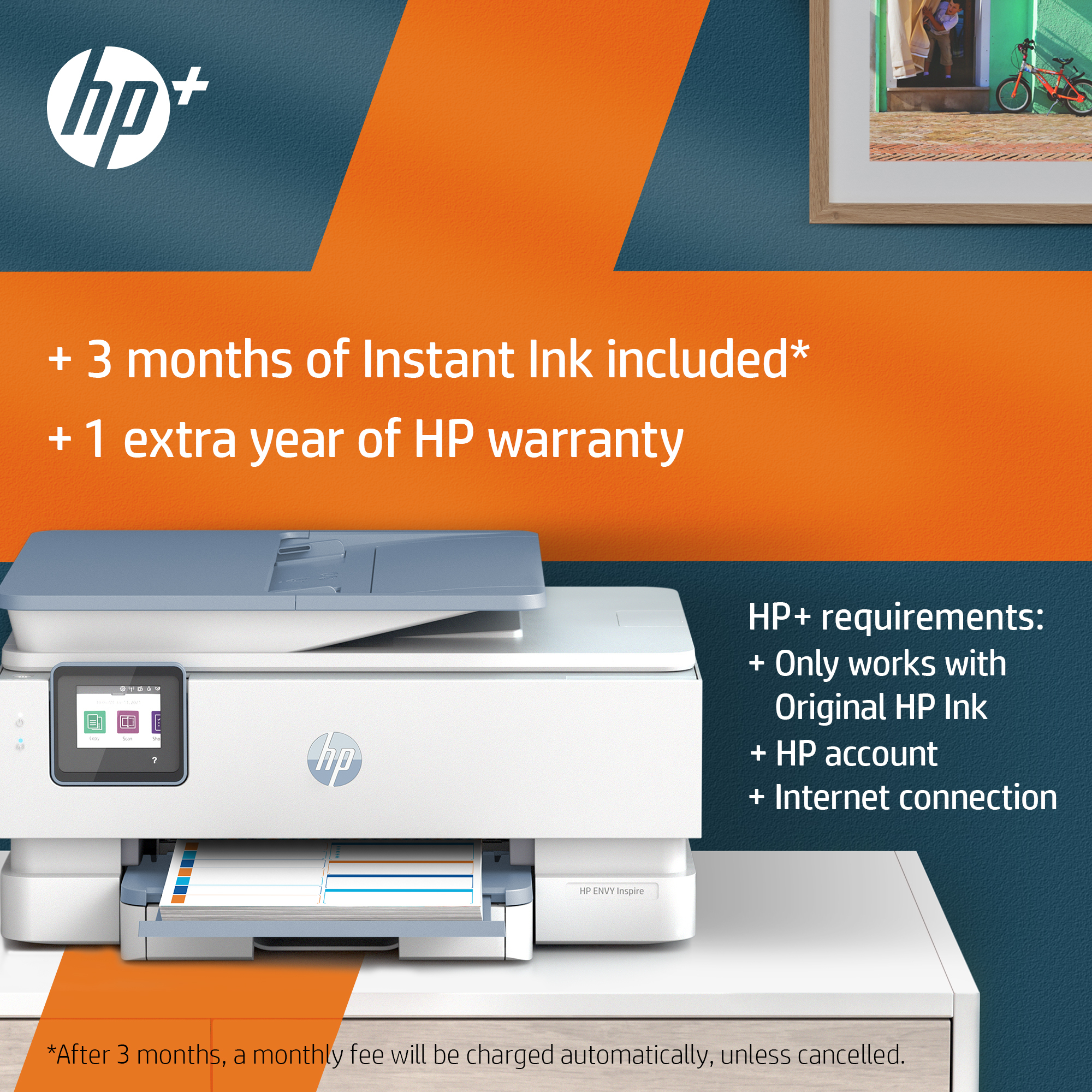 First 3 months of Instant Ink included with HP+;[2] after 3 months, monthly fee charged automatically unless cancelled.