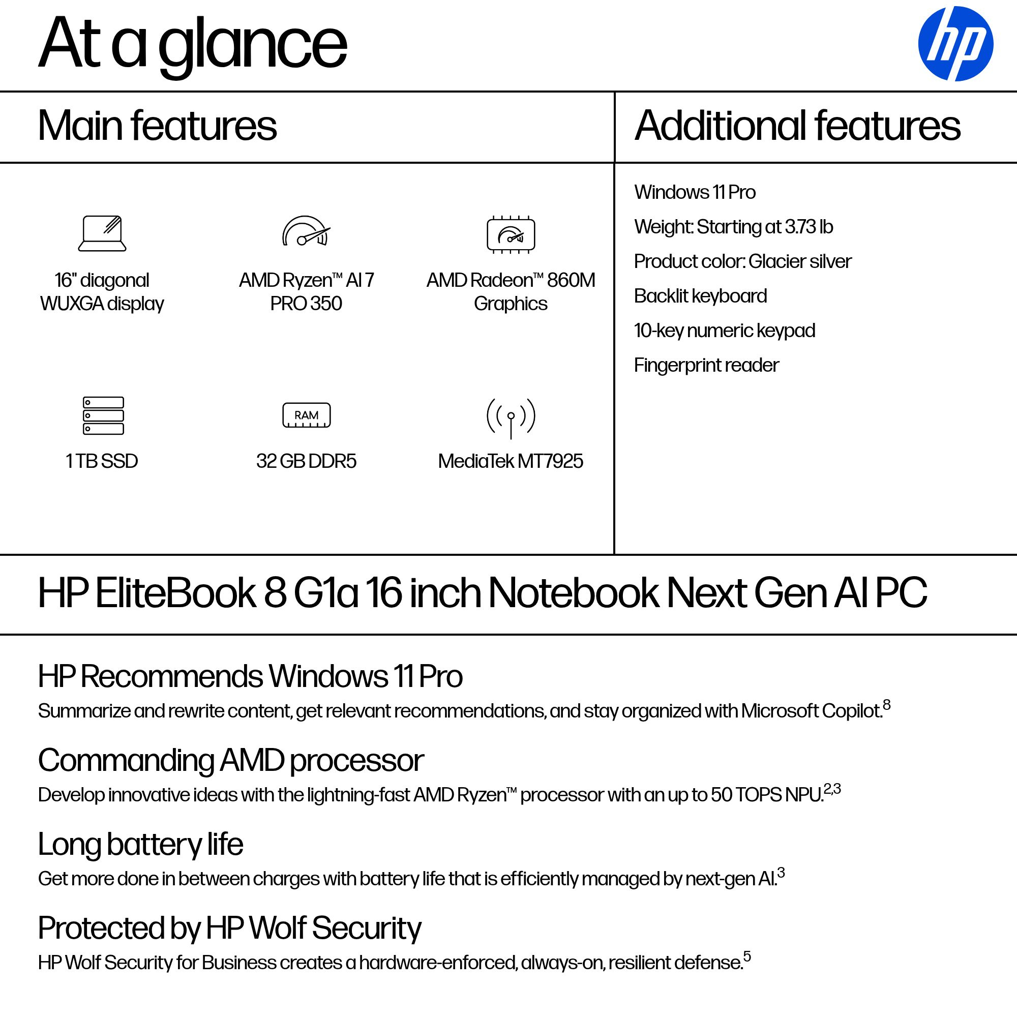HP EliteBook 8 G1a 16 inch Notebook Next Gen AI PC Copilot+ PC AMD Ryzen AI 7 PRO 16" WUXGA 32 GB DDR5-SDRAM Wi-Fi 7 (802.11be) Windows 11 Pro Silver