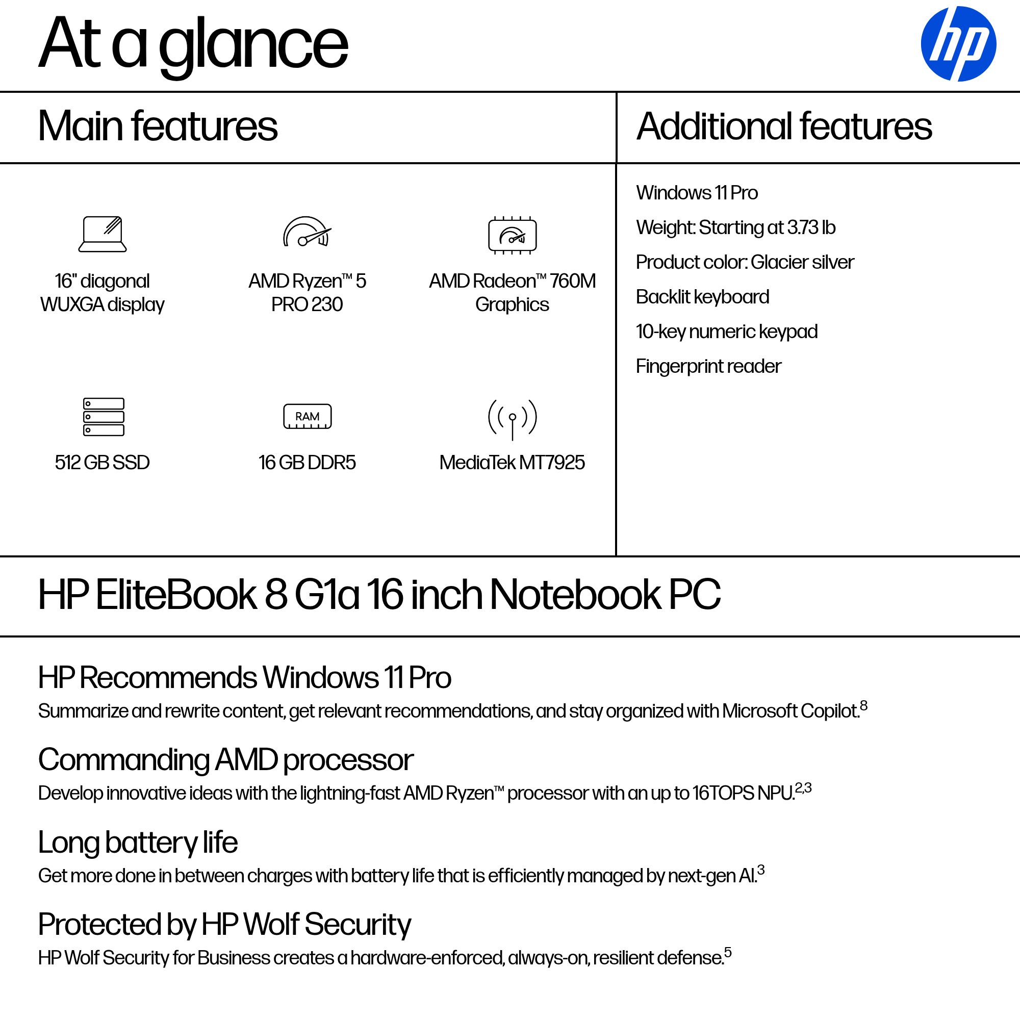 HP EliteBook 8 G1a 16 inch Notebook PC AMD Ryzen™ 5 PRO 230 16" WUXGA 16 GB DDR5-SDRAM Wi-Fi 7 (802.11be) Windows 11 Pro AI PC Silver