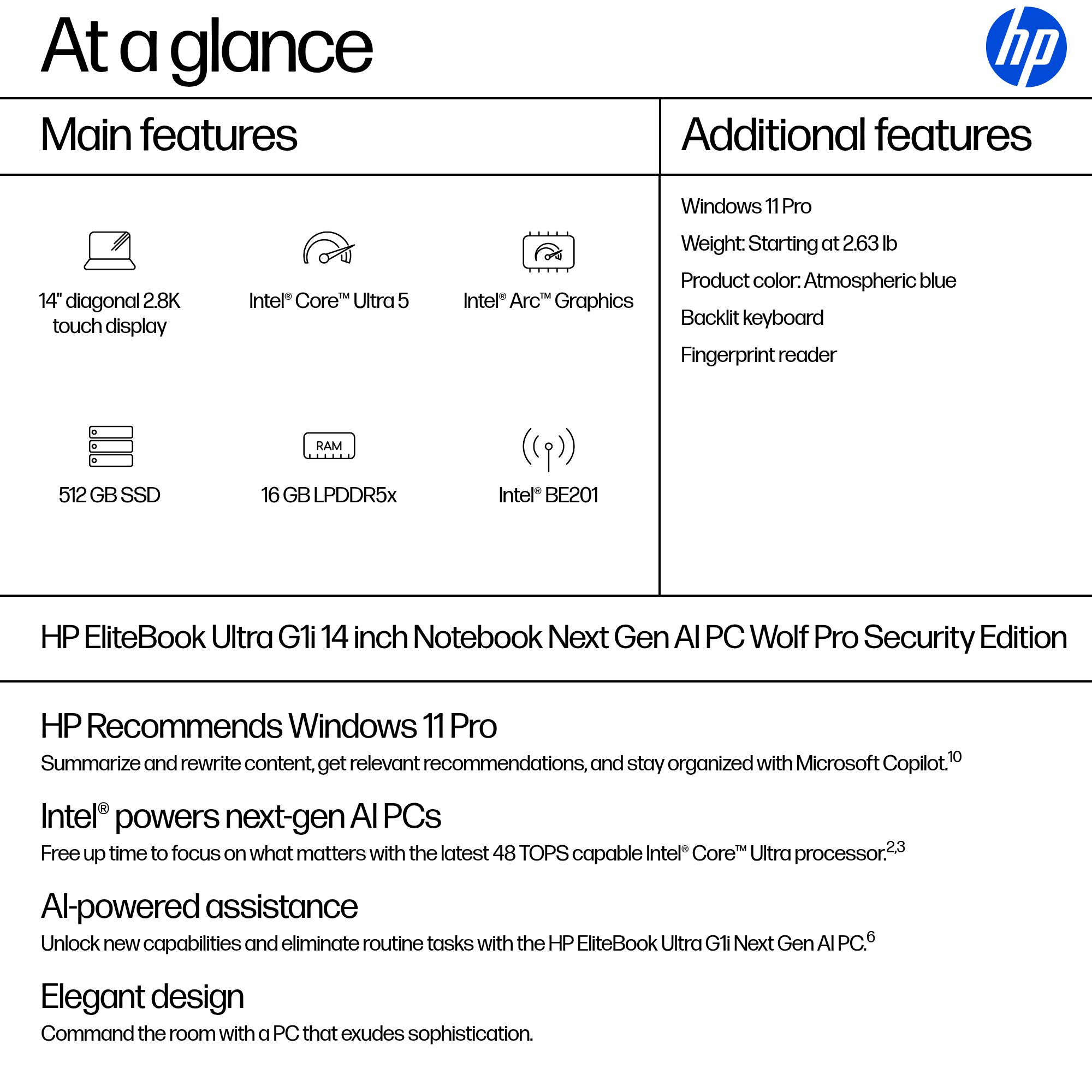 HP EliteBook Ultra G1i 14 inch Notebook Next Gen AI PC Wolf Pro Security Edition Copilot+ PC Intel Core Ultra 5 14" Touchscreen 2.8K 16 GB LPDDR5x-SDRAM Wi-Fi 7 (802.11be) Windows 11 Pro Blue
