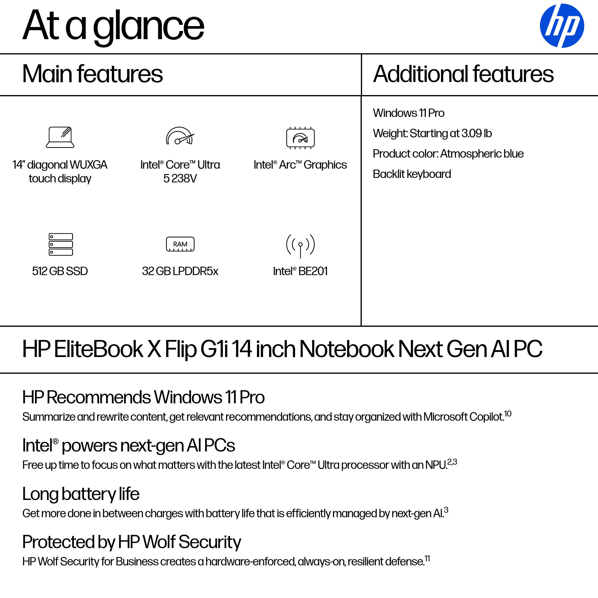 HP EliteBook X Flip G1i Next Gen AI PC Copilot+ PC Intel Core Ultra 5 238V Hybrid (2-in-1) 14" Touchscreen WUXGA 32 GB LPDDR5x-SDRAM 512 GB SSD Wi-Fi 7 (802.11be) Windows 11 Pro Blue