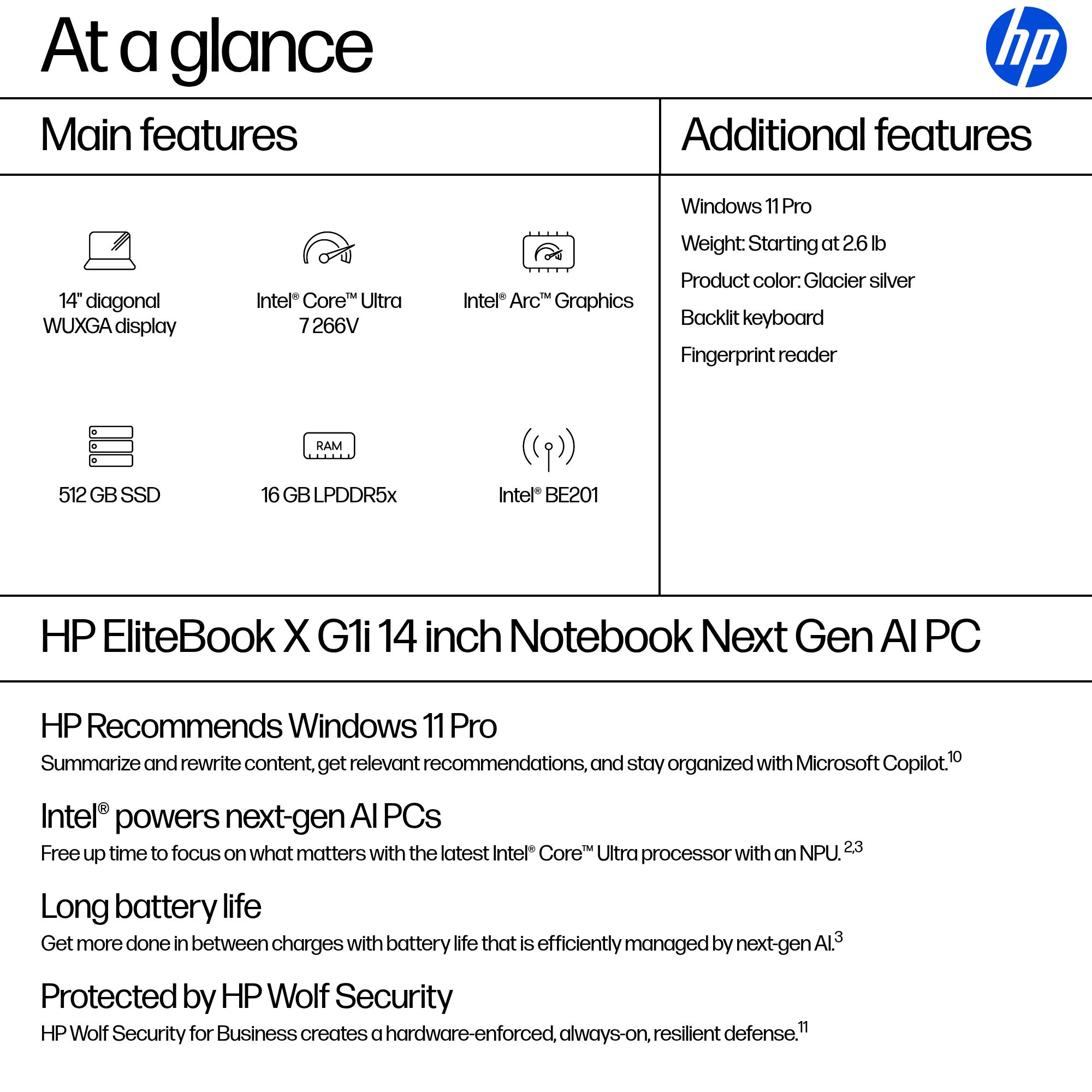 HP EliteBook X G1i 14 inch Notebook Next Gen AI PC Copilot+ PC Intel Core Ultra 7 266V 14" WUXGA 16 GB LPDDR5x-SDRAM Wi-Fi 7 (802.11be) Windows 11 Pro Silver
