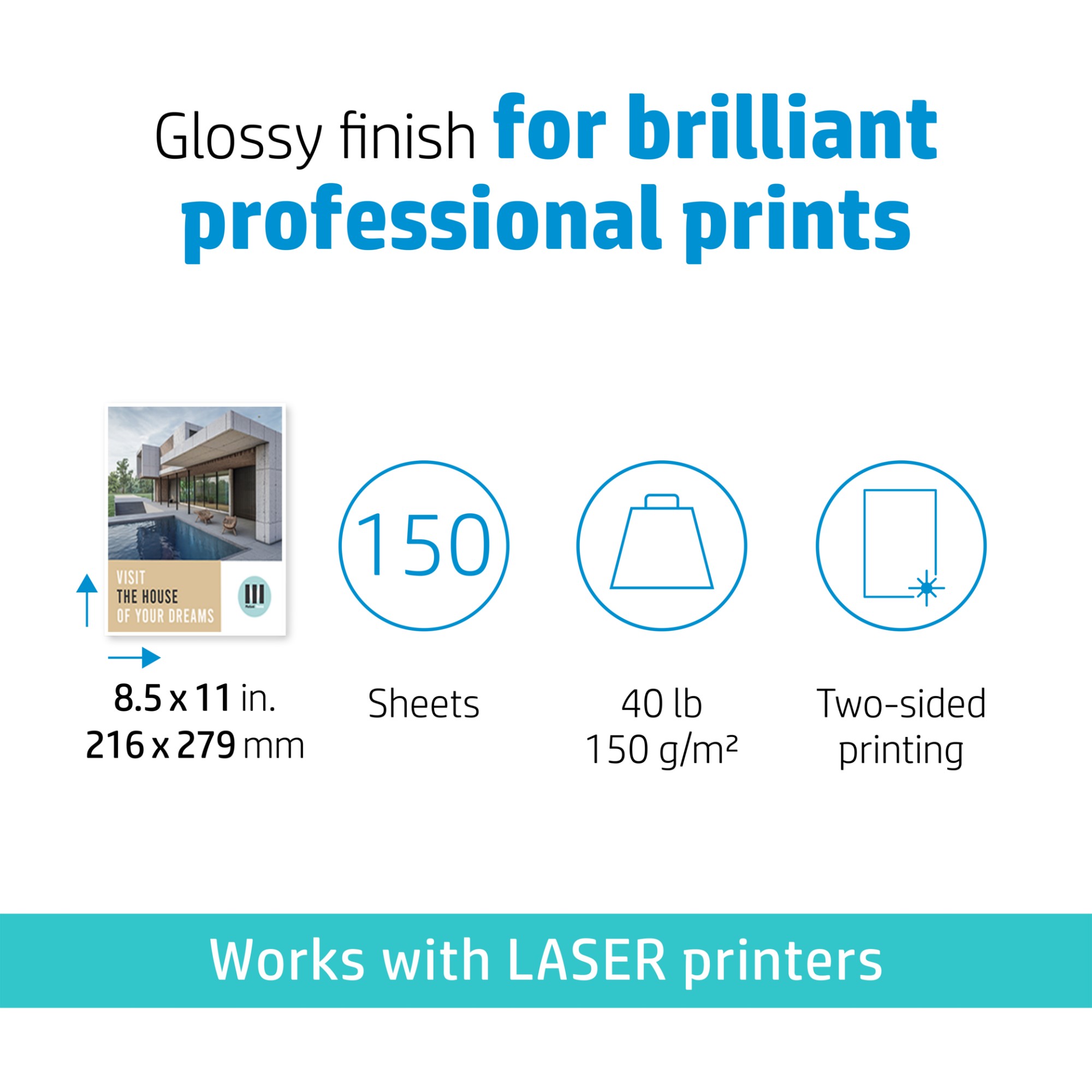 HP Enhanced Business Paper Glossy 40 lb 8.5 x 11 in. (216 x 279 mm) 150 sheets, Laser printing, 216x279 mm, Gloss, 150 sheets, 150 g/m², White