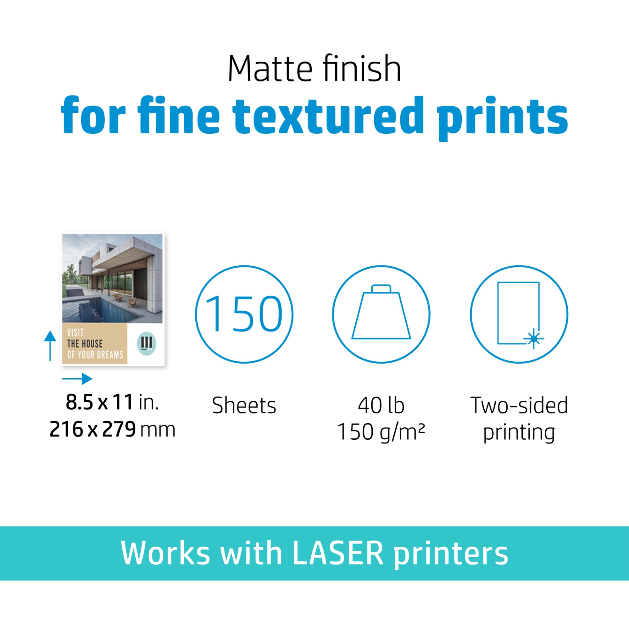 HP Enhanced Business Paper, Matte, 40 lb, 8.5 x 11 in. (216 x 279 mm), 150 sheets, Laser printing, 216x279 mm, Matt, 150 sheets, 150 g/m², 35 - 55%