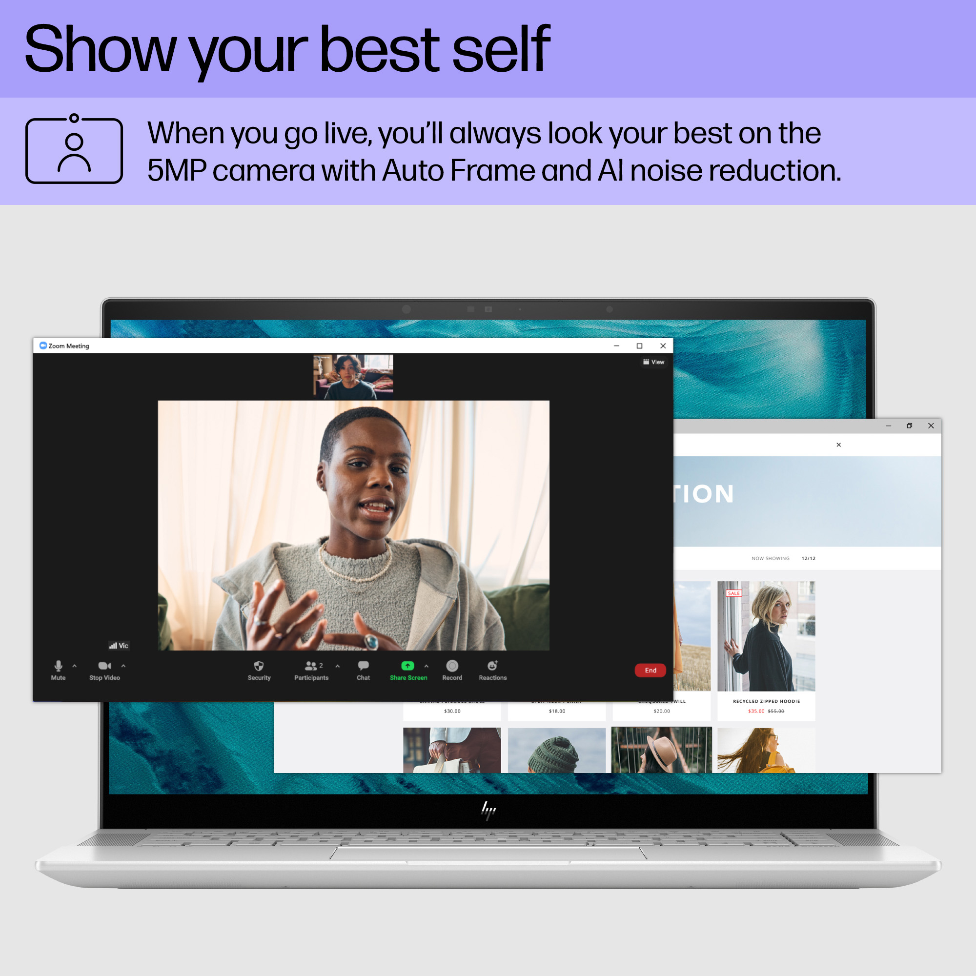 Experience clear video chats with AI Noise Reduction, and a 5MP camera<sup>[2]</sup> with Auto Frame plus a privacy shutter.