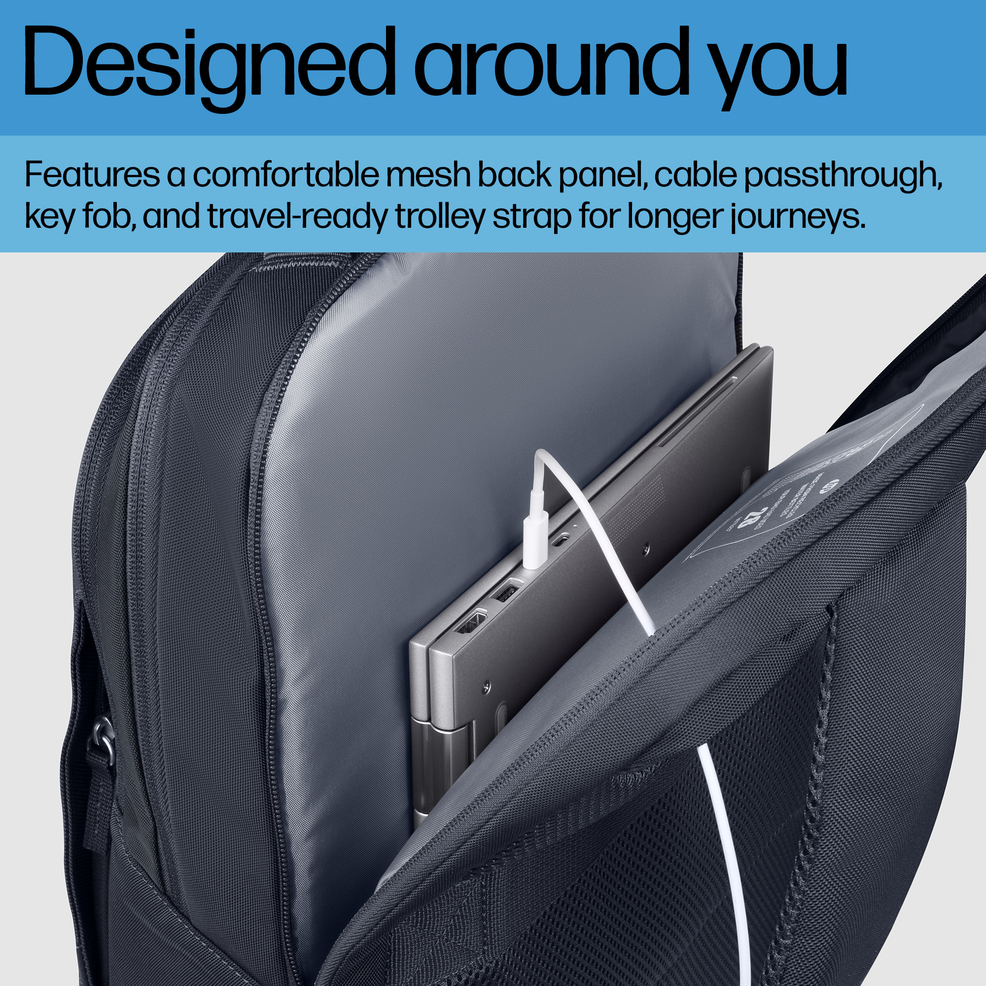 With a simple, functional design, you've got everything you need for wherever your day takes you. This laptop backpack features a comfortable mesh back panel, cable passthrough, and a key fob for convenience, plus a travel-ready trolley strap.
