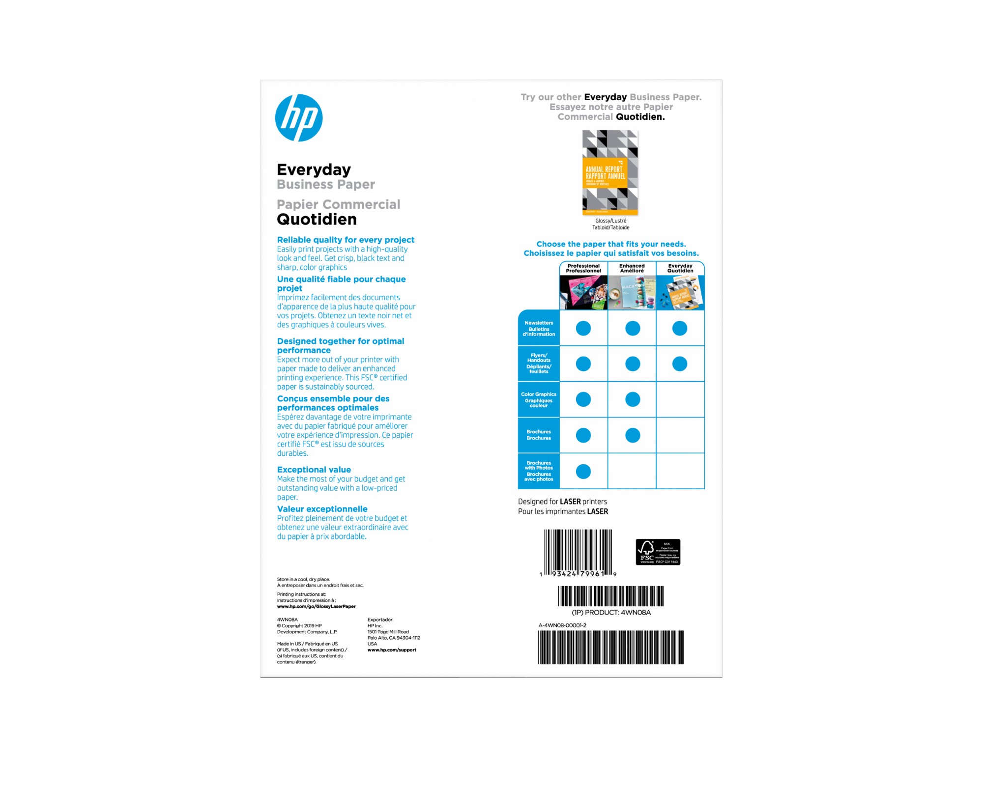 HP Everyday Business Paper, Glossy, 32 lb, 8.5 x 11 in. (216 x 279 mm), 150 sheets. Recommended usage: Laser printing, Paper size: 216x279 mm, Finish type: Gloss. Width: 8.5" (215.9 mm), Depth: 11" (279.4 mm), Height: 0.65" (16.5 mm). Number of cartons per pallet layer: 15 pc(s), Pallet weight: 2459.9 lbs (1115.8 kg), Number of cartons per pallet: 150 pc(s). Quantity per pallet: 900 pc(s), Country of origin: Singapore, Compatible products: Works with laser printers, optimized for Original HP Toner. Pallet dimensions (W x D x H): 40 x 48 x 46.2" (1016 x 1219.2 x 1173.5 mm), Stacking number for pallet: 1 pc(s), Pallet dimensions (W x D x H) (imperial): 40 x 48 x 46.2"
