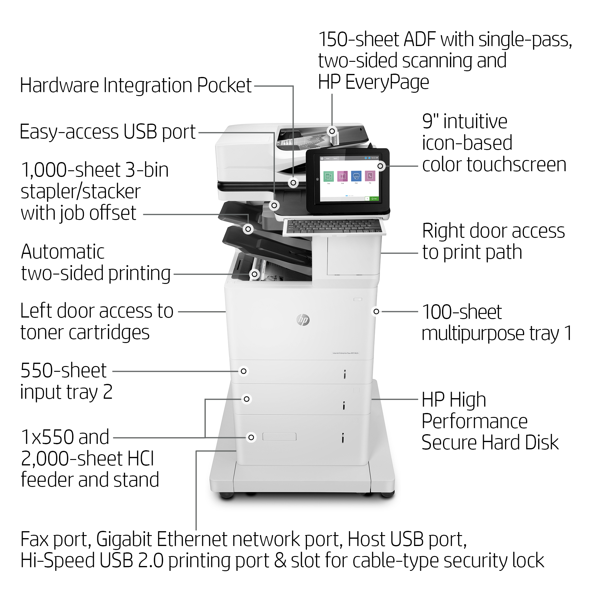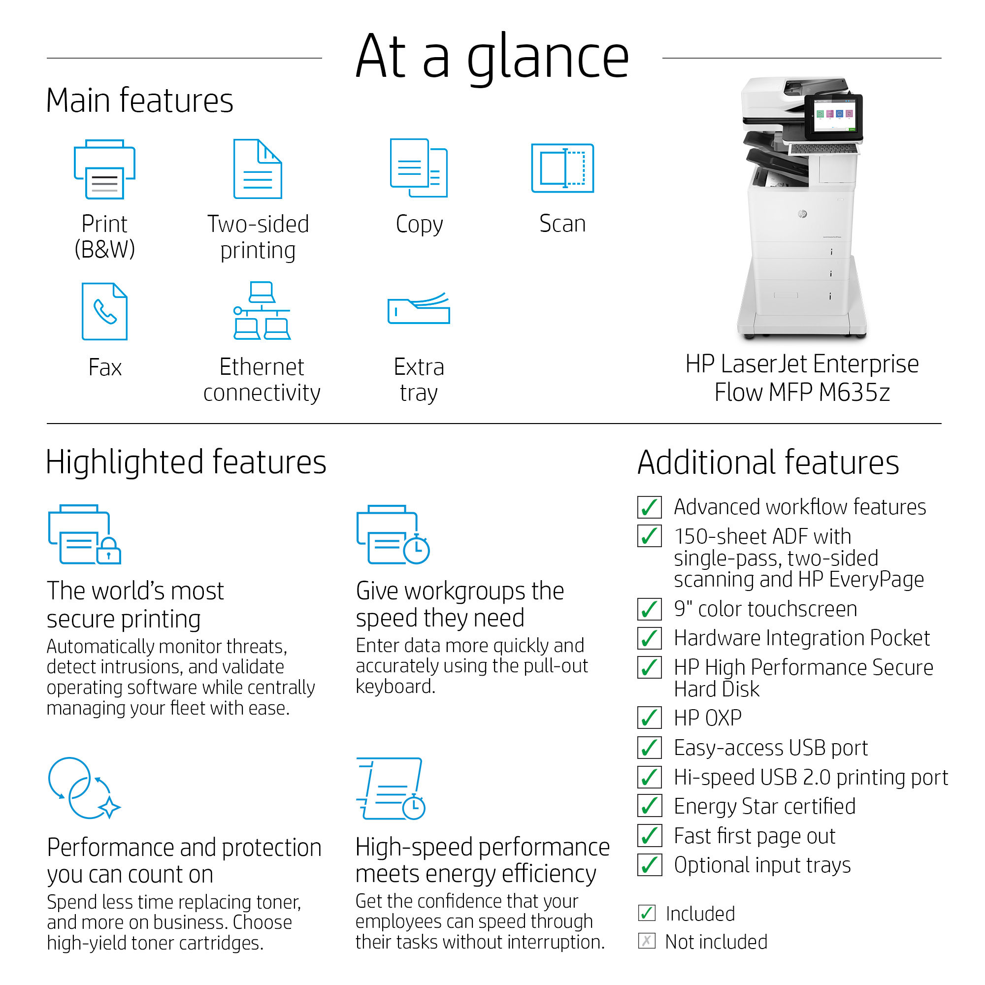 HP LaserJet Enterprise Flow LaserJet Enterprise M635z Multifunction Black and white Printer, Ethernet Only; Copier, Scanner. Print technology: Laser, Printing: Mono printing, Maximum resolution: 1200 x 1200 DPI. Copying: Mono copying, Maximum copy resolution: 600 x 600 DPI. Scanning: Color scanning, Optical scanning resolution: 600 x 600 DPI. Faxing: Color faxing. Duplex functions: Print, Copy. Maximum ISO A-series paper size: A4. Wi-Fi. Direct printing. Product color: Black, White