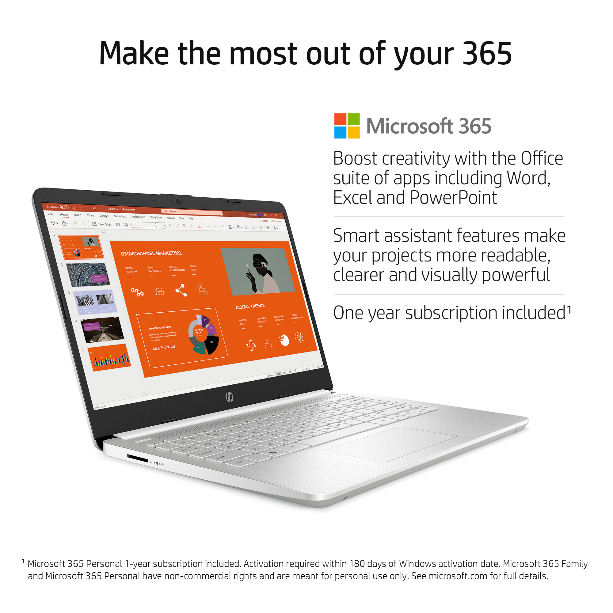 With a long battery life<sup>[1]</sup> and fast-charge technology, this laptop lets you work, watch, and stay connected all day. Integrated precision touchpad with multi-touch support speeds up both navigation and productivity.