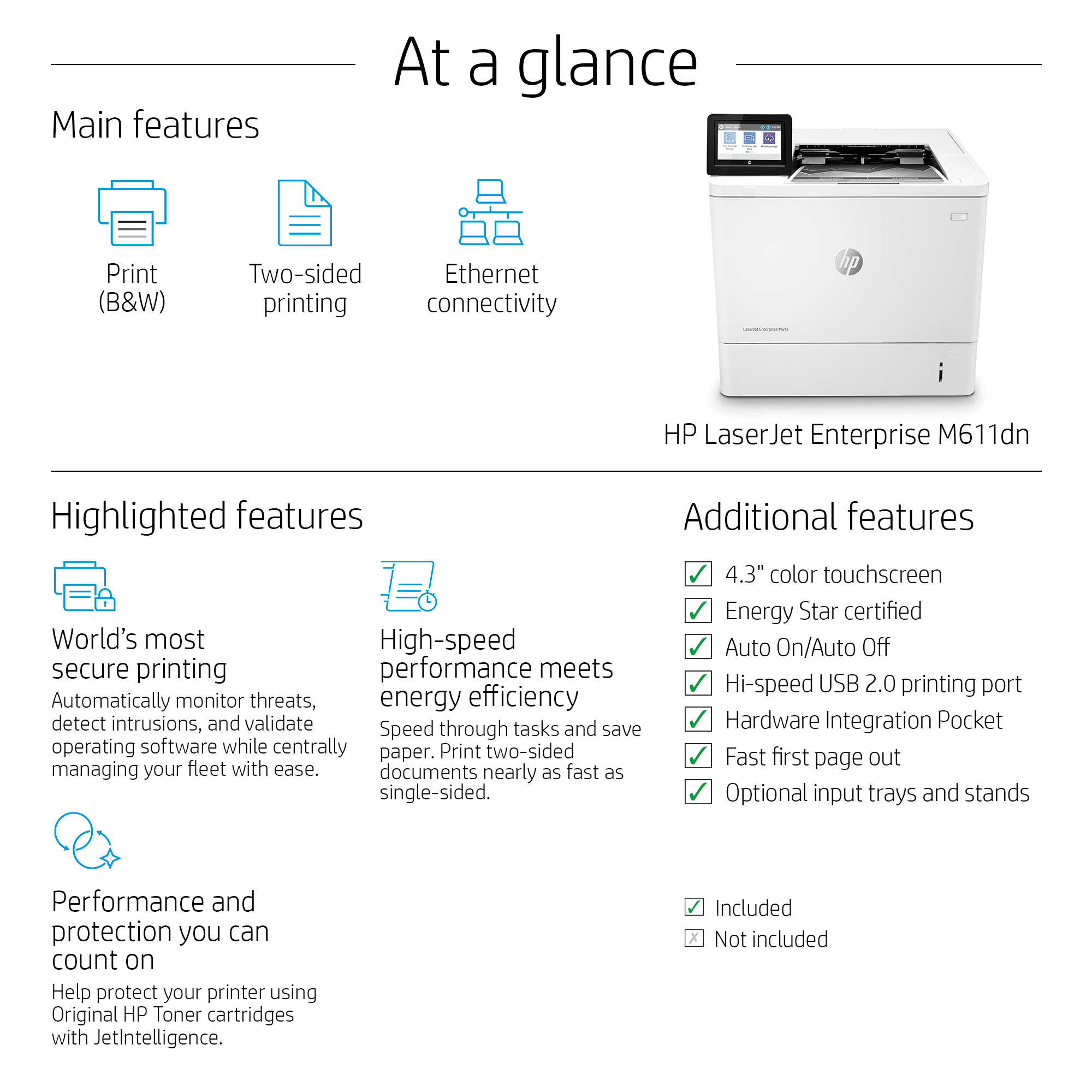 HP LaserJet Enterprise M611dn Black and white Printer, Ethernet Only; Duplex