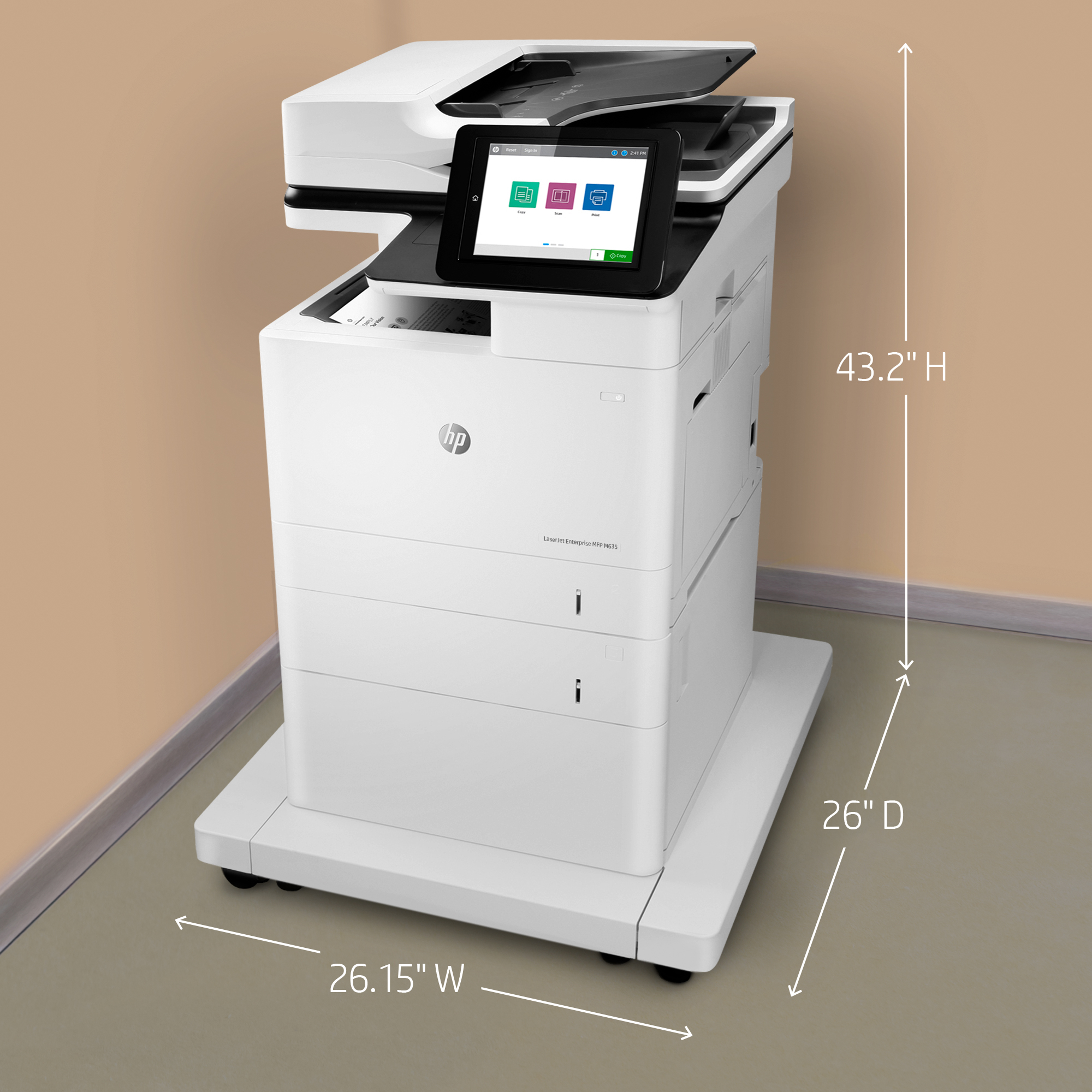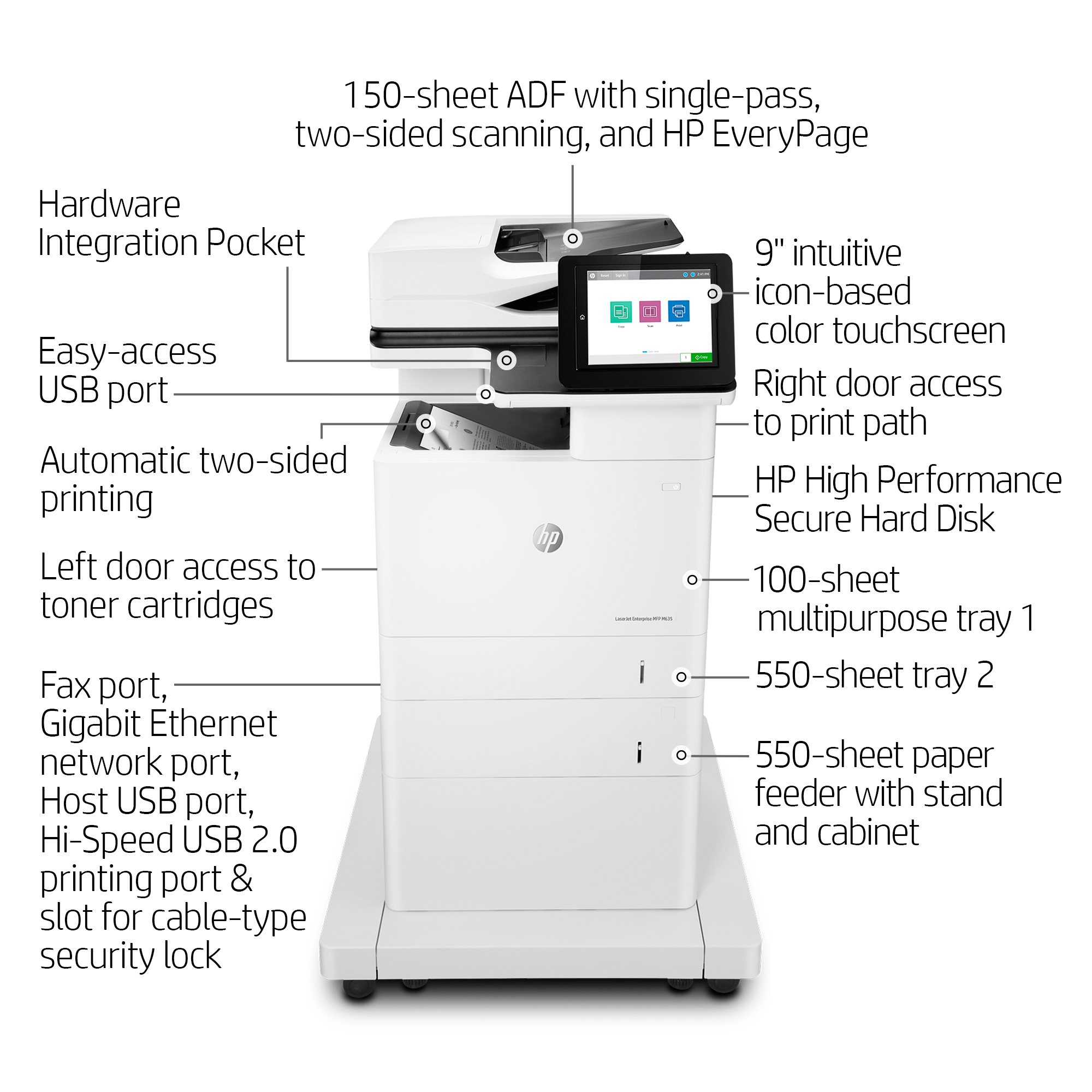 Paper handling options include a wheeled stand and 550-sheet input feeder for paper sizes 4 x 6" to legal.