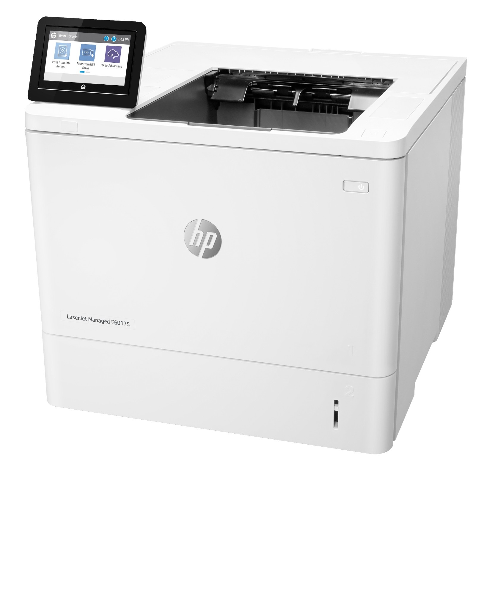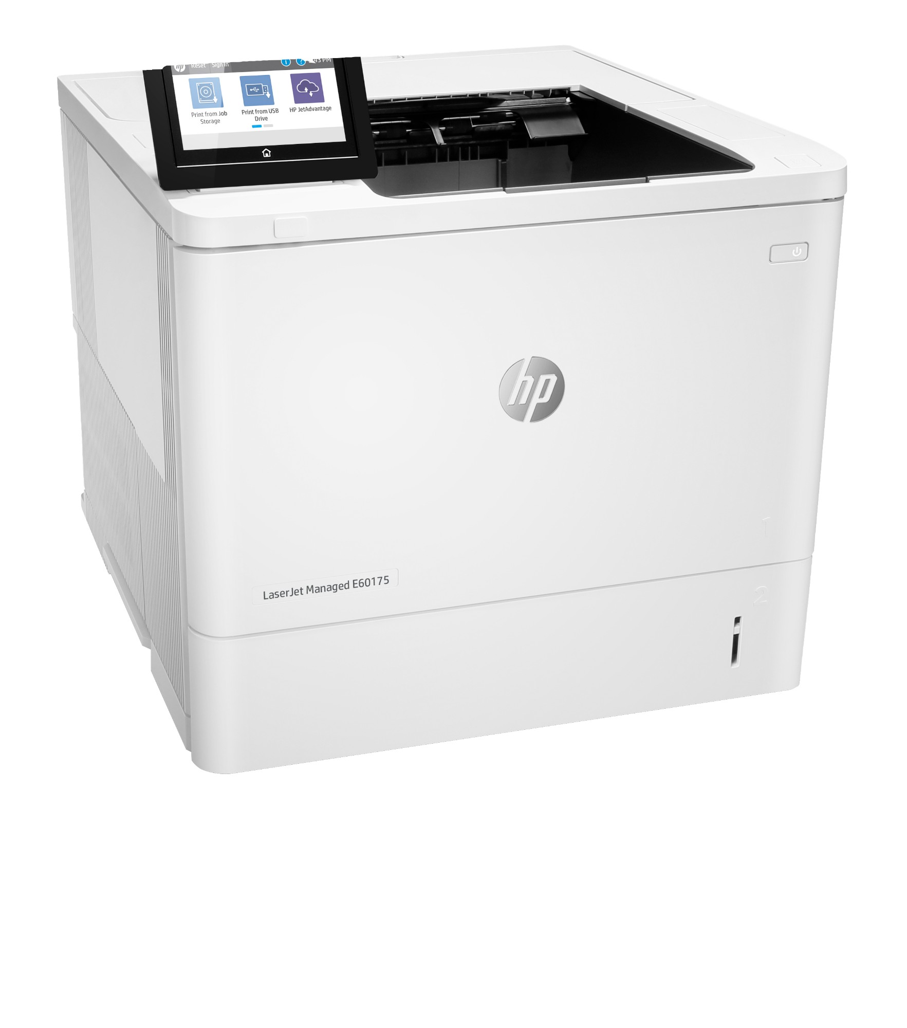 | Box contents | HP LaserJet Managed E60175dn Printer; HP Original LaserJet Toner Cartridge (~11,000 pages); Documentation (Hardware Install Guide); Power cord; Fixed-Size Cassette Guides |