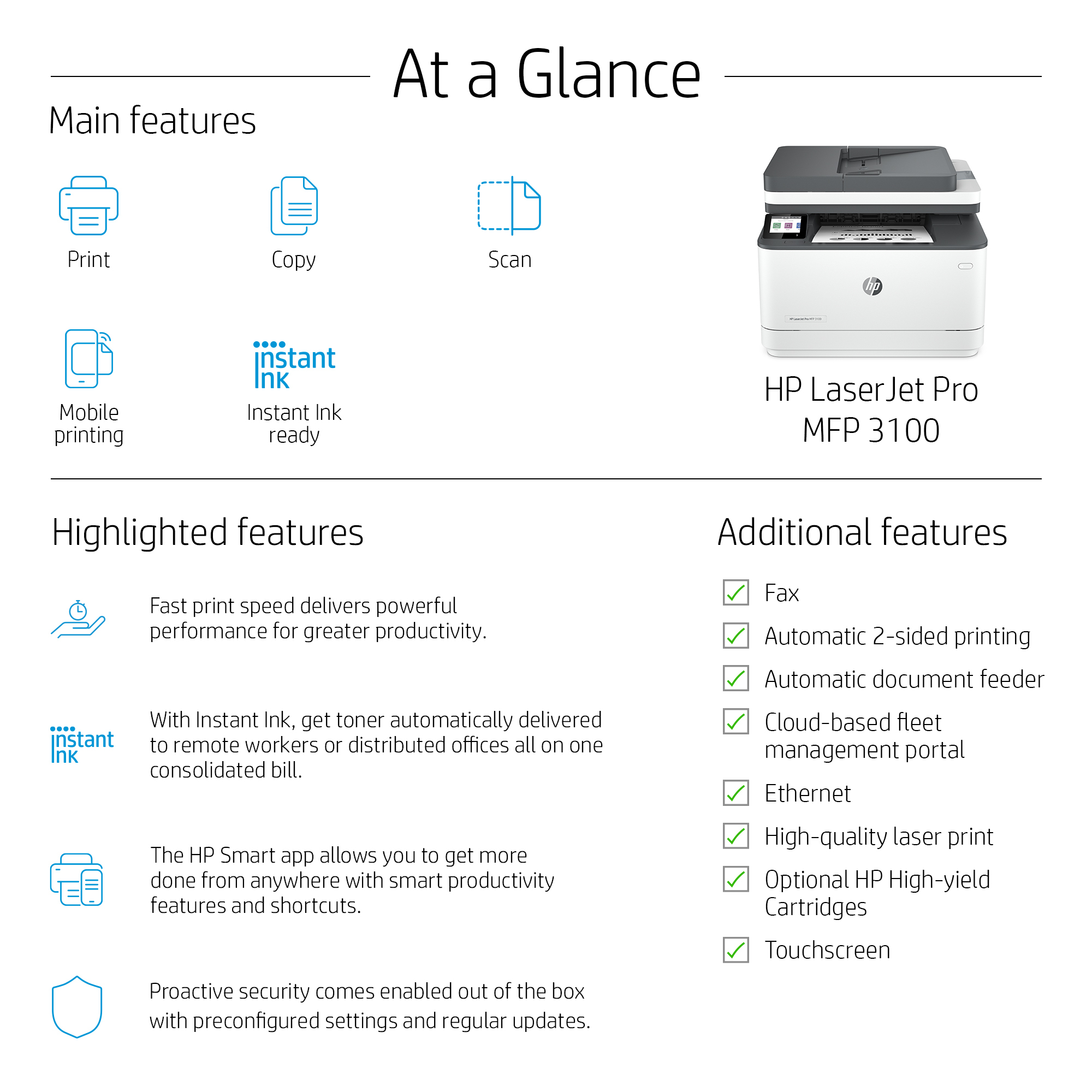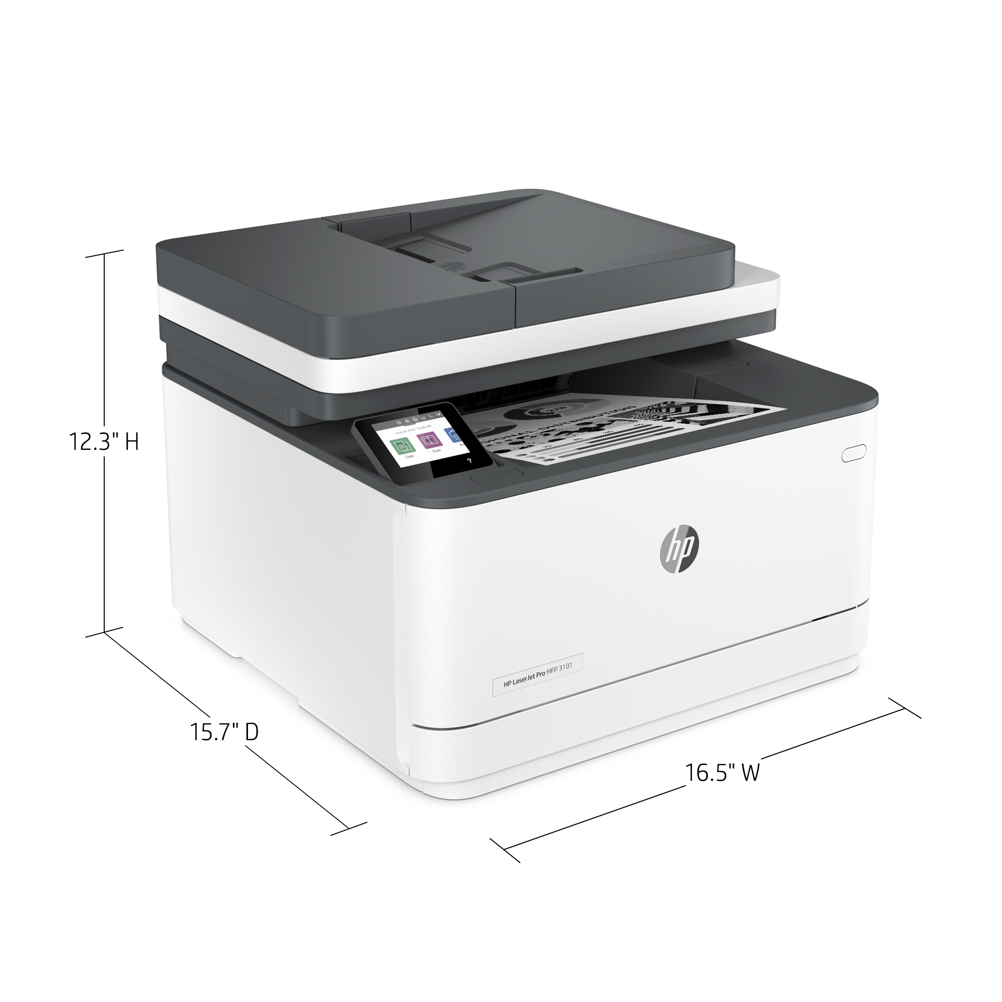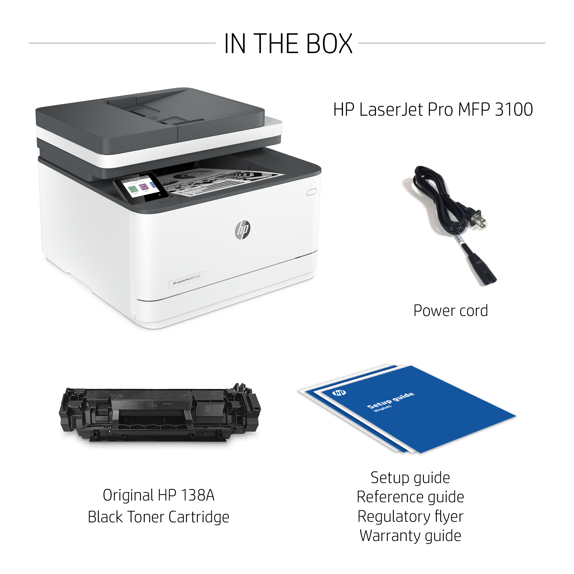 | Box contents | HP LaserJet Pro MFP 3101fdw Printer, Preinstalled HP Black Original LaserJet Toner Cartridge, Setup Guide, Reference Guide, Regulatory Flyer, Warranty Guide, Power cord |