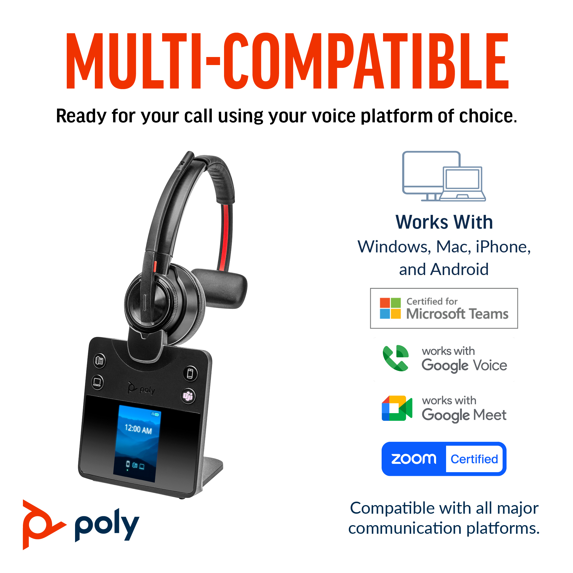 Enjoy the convenience of hands-free calling and a longer roaming range with the Poly Savi 8400 office series. With up to 13 hours of talk time and the ability to roam up to 590 ft / 180 m means you can keep the calls going, even away from the desk [2].