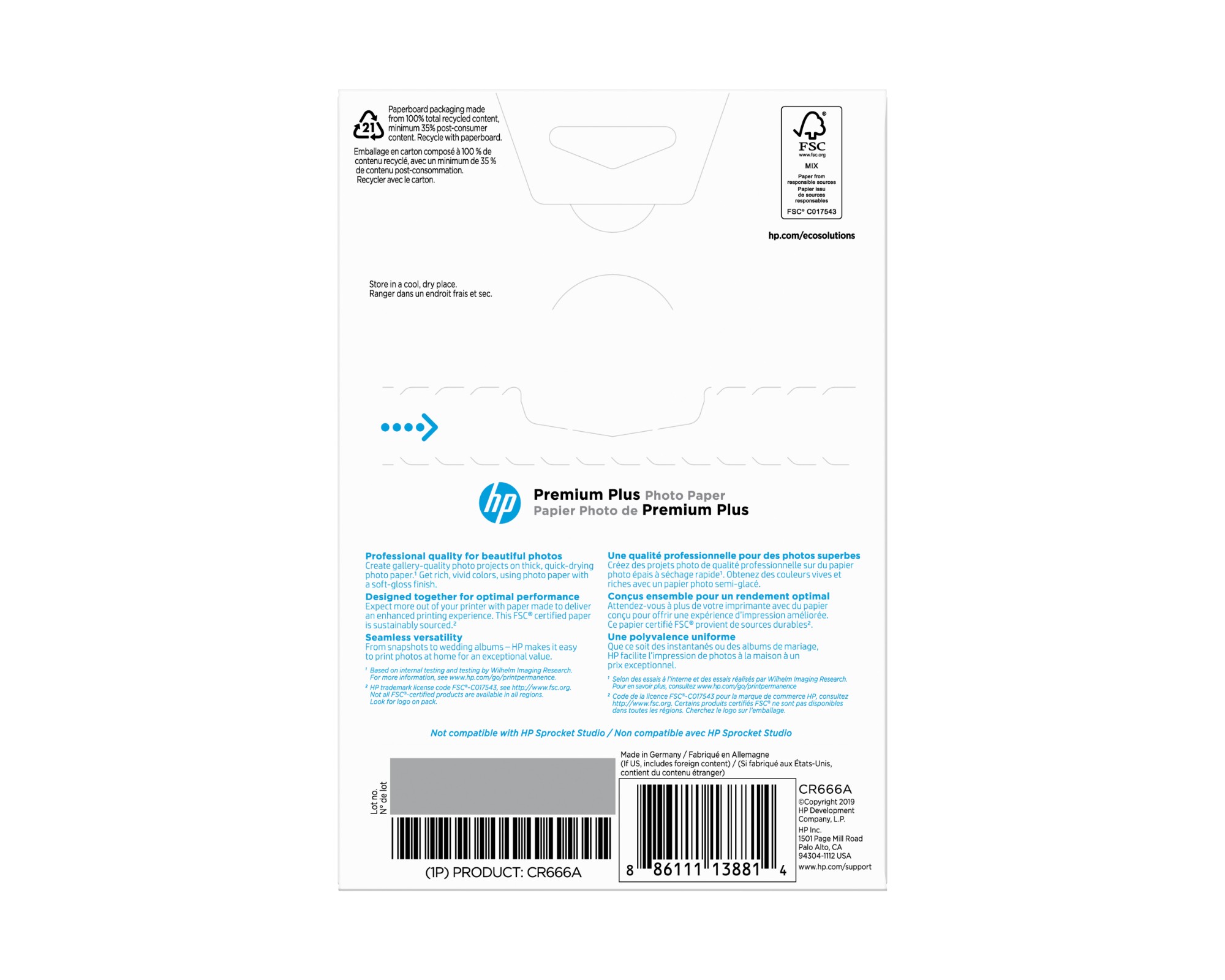 HP Premium Plus Photo Paper, Satin, 80 lb, 4 x 6 in. (101 x 152 mm), 100 sheets, 300 g/m², 11.5 µm, Works with inkjet printers, optimized for Original HP Ink, Home, Home office, 15 - 35 °C, 0 - 40 °C