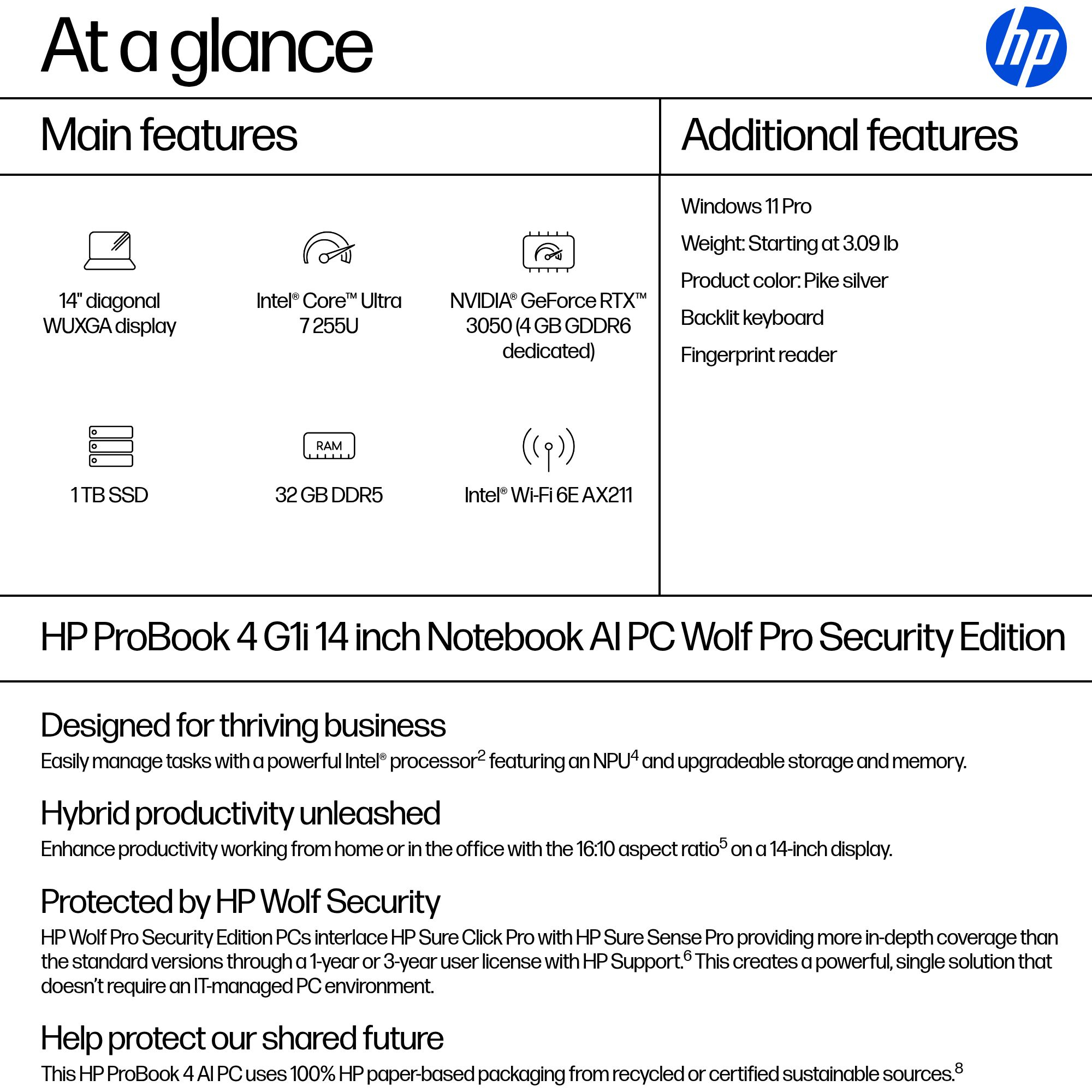 HP ProBook 4 G1i 14 inch Notebook AI PC Wolf Pro Security Edition Intel Core Ultra 7 14" WUXGA 32 GB DDR5-SDRAM Silver