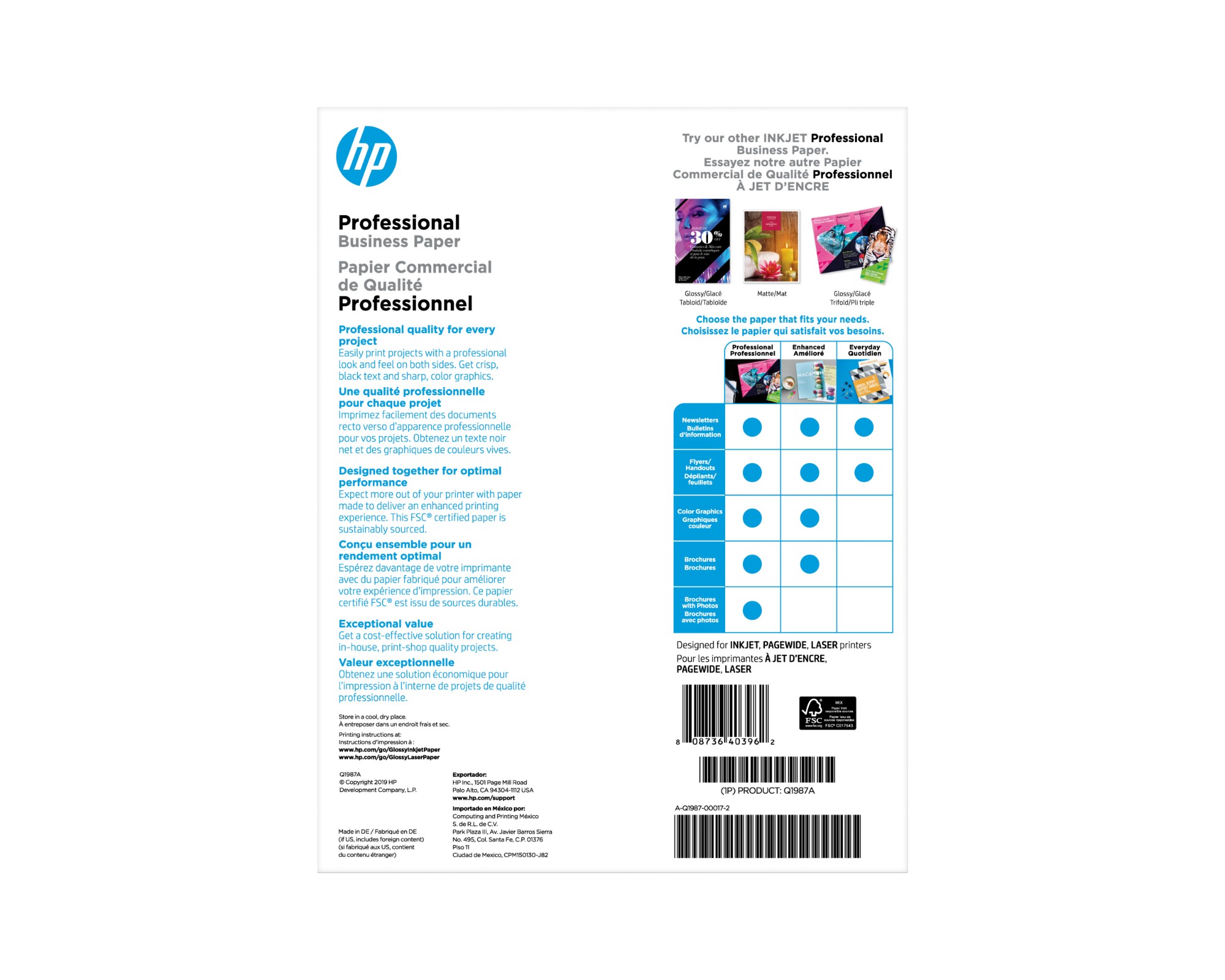 HP Professional Business Paper Glossy 48 lb 8.5 x 11 in. (216 x 279 mm) 150 sheets. Paper size: 216x279 mm, Finish type: Gloss, Media weight: 180 g/m². Package weight: 3.75 lbs (1.7 kg). Package dimensions (WxDxH): 9.37 x 12 x 1.31" (238 x 304 x 33.3 mm), Media sheets per package: 150 sheets, Country of origin: Germany
