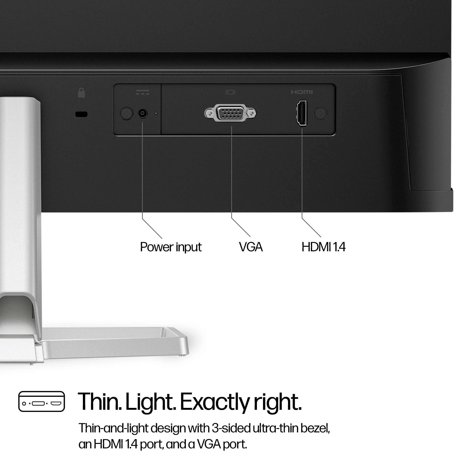 This thin-and-light 23.8-inch FHD monitor is designed to look great in any space. Whether learning, playing, or watching content, its ultra-thin 3-sided borderless design lets you create a seamless dual-screen setup for enhanced viewing, while the simplified cable management cuts the clutter. Plus, easily connect with HDMI 1.4 and VGA ports.
