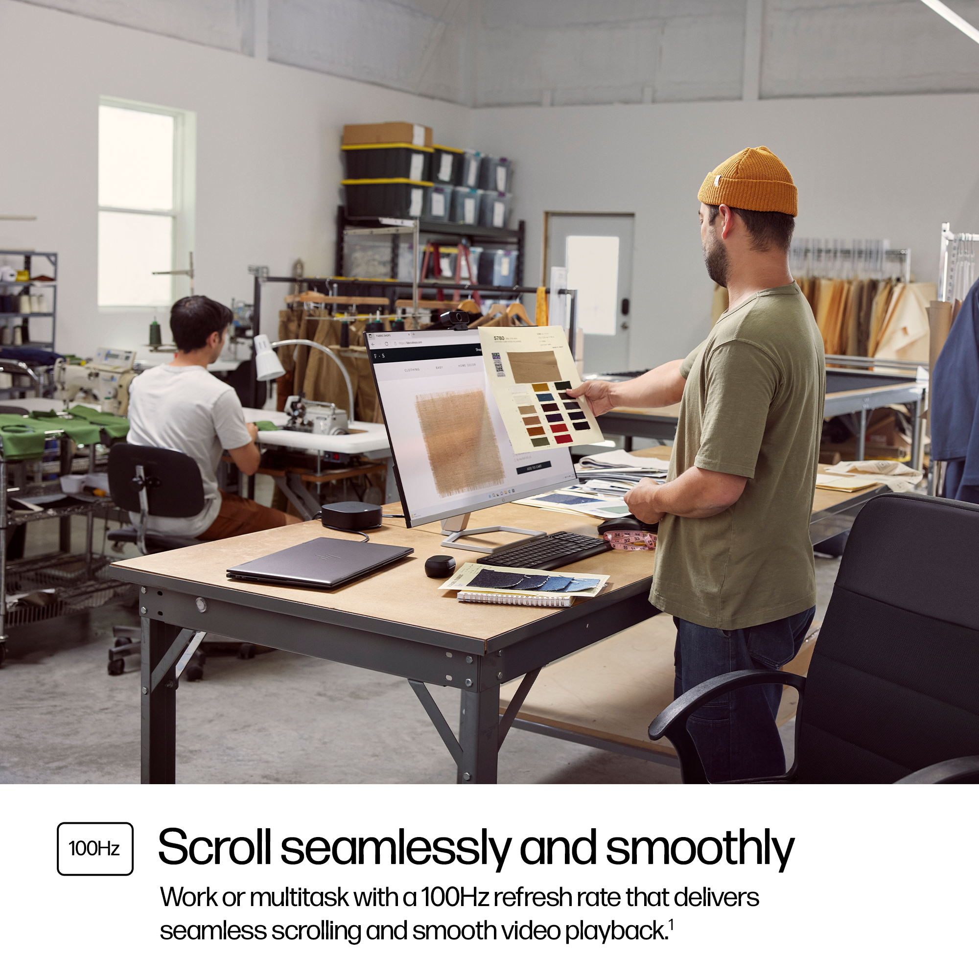Sit back and soak in all the content you love with this exceptional 23.8" FHD monitor. Experience colorful imagery and vibrant detail like they were intended with 99% sRGB color, deep 1500:1 contrast ratio, and 300 nits brightness.<sup>[1]</sup> Its 100 Hz refresh rate delivers seamless scrolling and smooth, stutter-free viewing.
