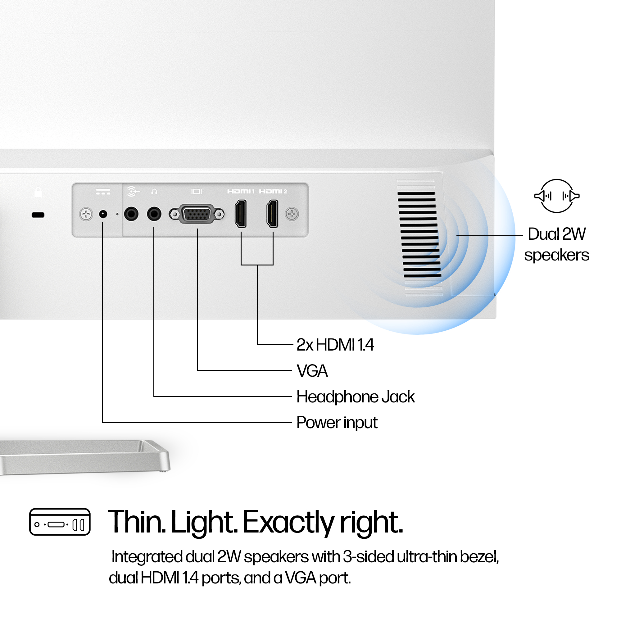 This thin-and-light 27" FHD monitor is designed to look great in any space. Whether learning, playing, or watching content, enjoy crisp audio with integrated dual 2W speakers. Its ultra-thin 3-sided borderless design lets you create a seamless dual-screen setup for enhanced viewing. Plus, have more options to connect with one VGA and two HDMI 1.4 ports.