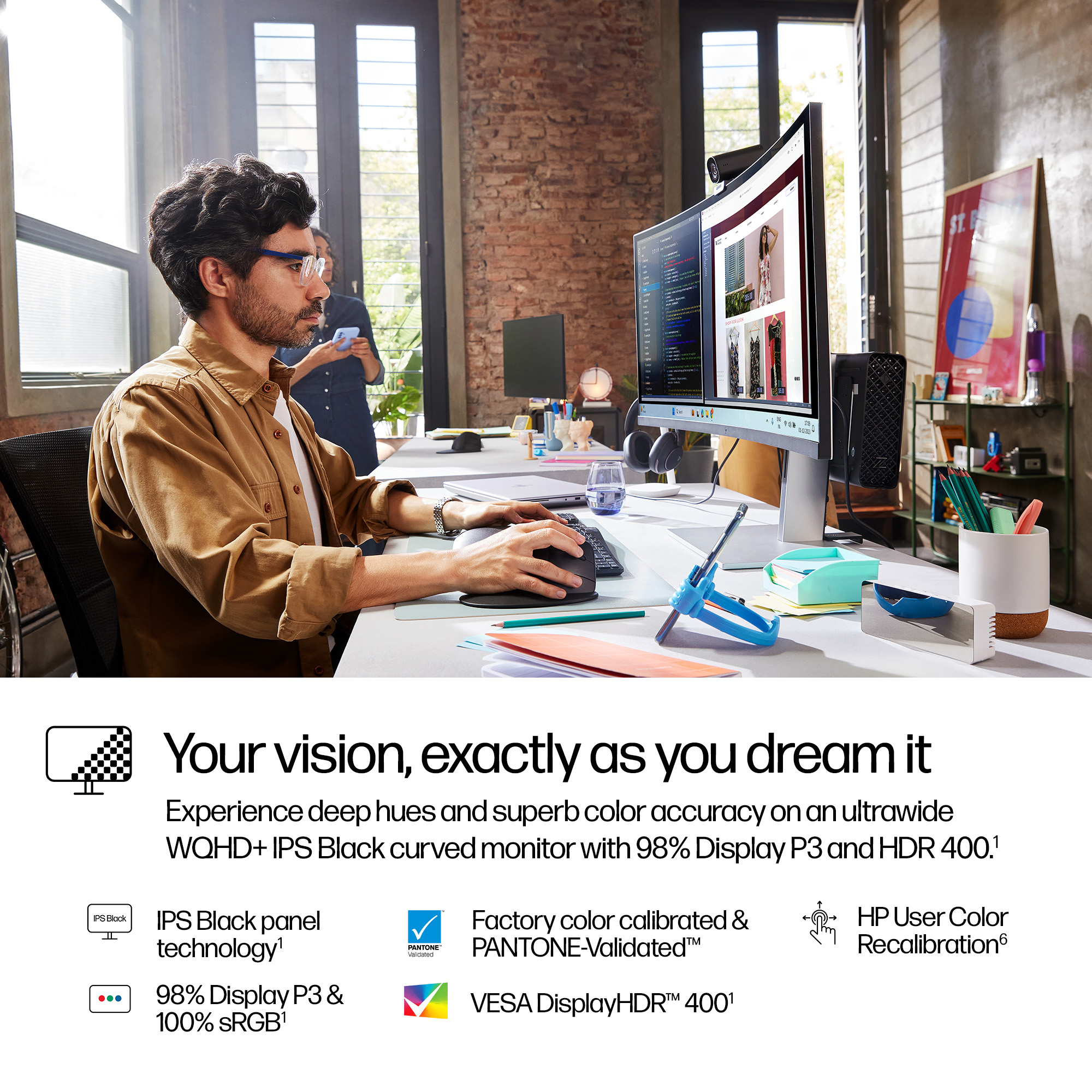 Treat your creative vision to brilliance straight from the box with factory-calibrated color accuracy on a DreamColor-class display.<sup>[1]</sup> The panoramic canvas delivers vivid colors and rich contrast thanks to IPS Black, HDR400, 98% Display P3, and more.<sup>[2]</sup>