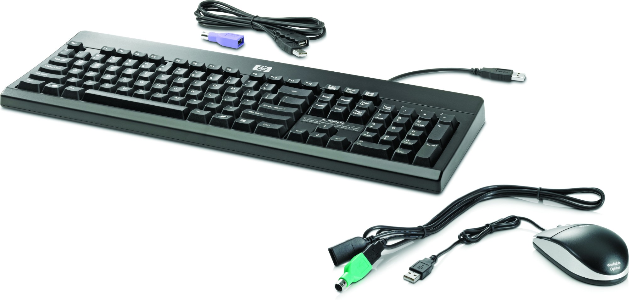 HP USB PS2 Washable Keyboard and Mouse. Keyboard form factor: Full-size (100%). Keyboard style: Straight. Connectivity technology: Wired, Device interface: USB + PS/2. Cable length: 86.6" (2.2 m). Recommended usage: Office. Product color: Black. Mouse included