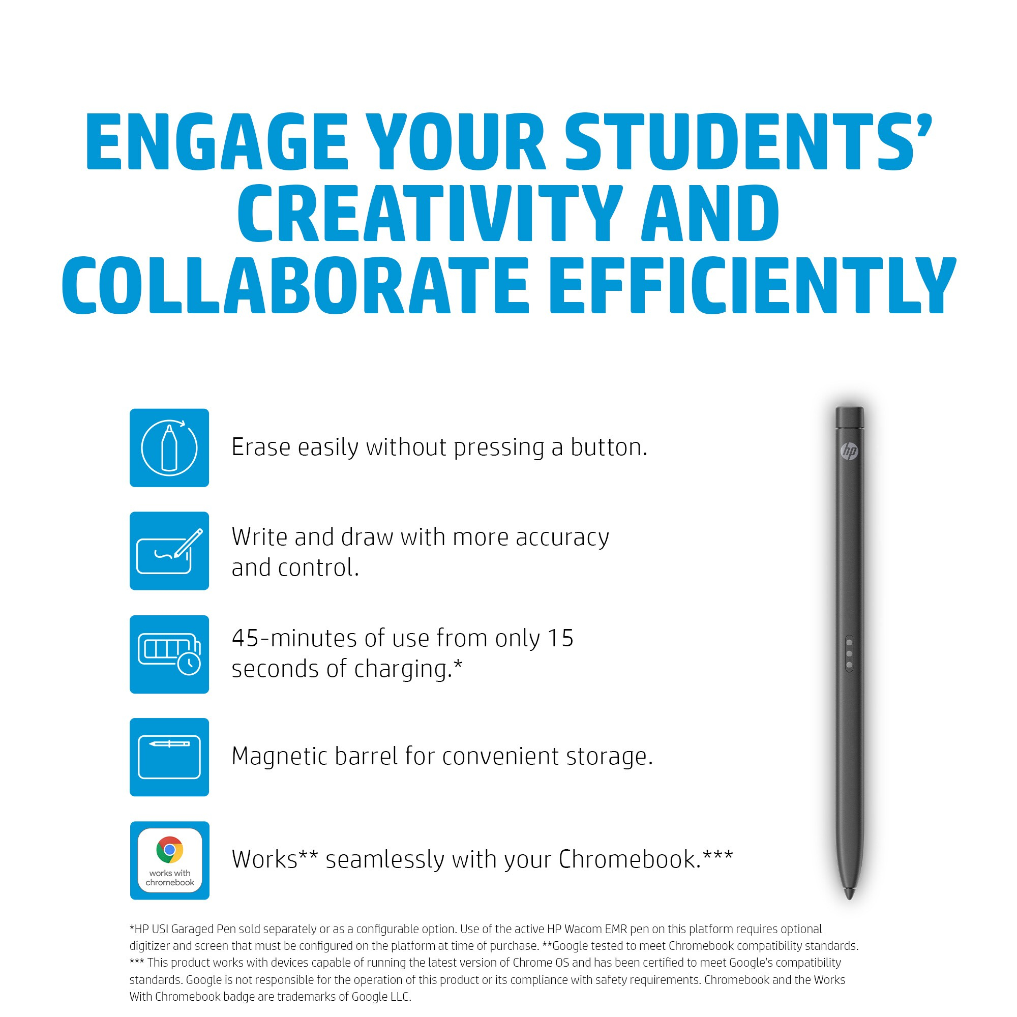 Park your HP Garaged Pen in the magnetic cradle of your HP Chromebook x360 11 G4 Education Edition[1] and get 45 minutes of use from just 15 seconds of wireless charging — no cords or cables needed. With super-fast pogo pin charging it's ready when you are to write, draw, and create.