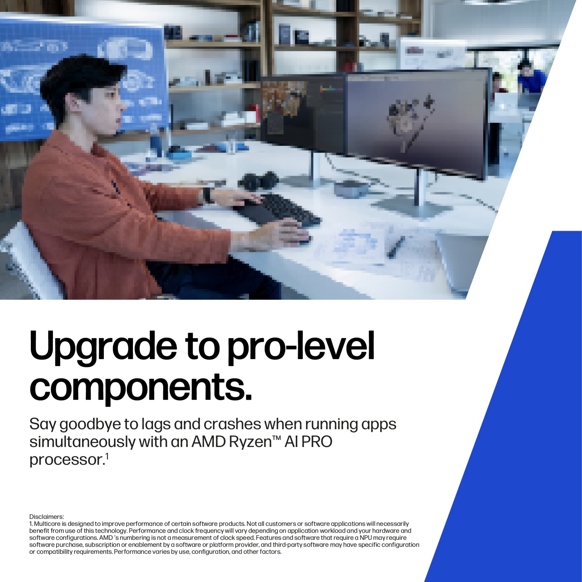 Say goodbye to lags and crashes with fast responsiveness on projects. With up to an AMD Ryzen™ 5 PRO 230 processor[2] and large memory configurations,[3] open large files and run pro apps simultaneously for speedy multitasking and increased productivity.
